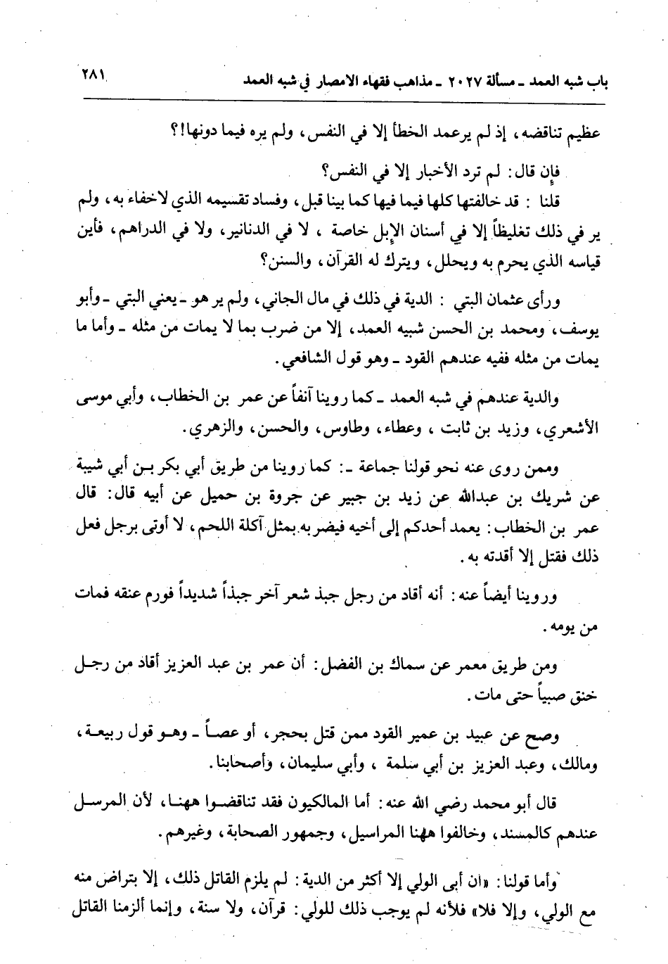عَظِيمِ تَنَاقُضِهِ، إذْ لَمْ يَرَ عَمْدَ الْخَطَأِ إلَّا فِي النَّفْسِ، وَلَمْ يَرَهُ فِيمَا دُونَهَا؟ فَإِنْ قَالَ: لَمْ تَرِدْ الْأَخْبَارُ إلَّا فِي النَّفْسِ؟ قُلْنَا: قَدْ خَالَفْتَهَا كُلَّهَا فِيمَا فِيهَا كَمَا بَيَّنَّا قَبْلُ، وَفَسَادُ تَقْسِيمِهِ الَّذِي لَا خَفَاءَ بِهِ، وَلَمْ يَرَ فِي ذَلِكَ تَغْلِيظًا إلَّا فِي أَسْنَانِ الْإِبِلِ خَاصَّةً، لَا فِي الدَّنَانِيرِ، وَلَا فِي الدَّرَاهِمِ، فَأَيْنَ قِيَاسُهُ الَّذِي يُحَرِّمُ بِهِ وَيُحَلِّلُ، وَيَتْرُكُ لَهُ الْقُرْآنَ، وَالسُّنَنَ؟ وَرَأَى عُثْمَانُ الْبَتِّيُّ: الدِّيَةَ فِي ذَلِكَ فِي مَالِ الْجَانِي، وَلَمْ يَرَ هُوَ - يَعْنِي الْبَتِّيَّ - وَأَبُو يُوسُفَ، وَمُحَمَّدُ بْنُ الْحَسَنِ شَبِيهَ الْعَمْدِ، إلَّا مَنْ ضَرَبَ بِمَا لَا يُمَاتُ مِنْ مِثْلِهِ - وَأَمَّا مَا يُمَاتُ مِنْ مِثْلِهِ فَفِيهِ عِنْدَهُمْ الْقَوَدُ - وَهُوَ قَوْلُ الشَّافِعِيِّ.