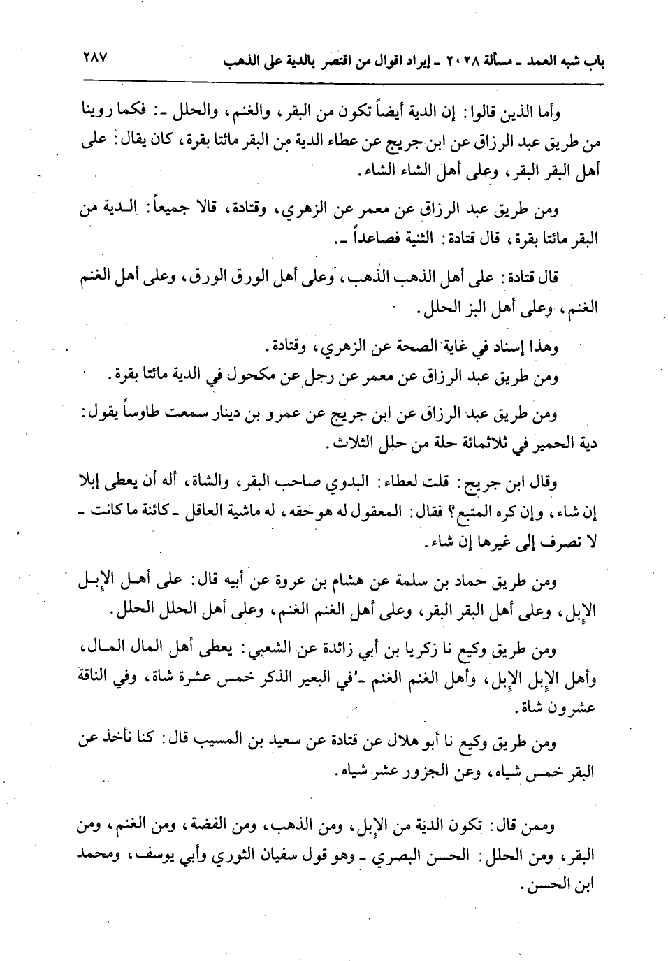 وَمِنْ طَرِيقِ عَبْدِ الرَّزَّاقِ عَنْ ابْنِ جُرَيْجٍ عَنْ عَمْرِو بْنِ دِينَارٍ سَمِعْت طَاوُسًا يَقُولُ: دِيَةُ الْحَمِيرِ فِي ثَلَاثِمِائَةِ حُلَّةٍ مِنْ حُلَلِ الثَّلَاثِ. وَقَالَ ابْنُ جُرَيْجٍ: قُلْت لِعَطَاءٍ: الْبَدْوِيُّ صَاحِبُ الْبَقَرِ، وَالشَّاةِ، أَلَهُ أَنْ يُعْطَى إبِلًا إنْ شَاءَ، وَإِنْ كَرِهَ الْمُتْبِعُ؟ فَقَالَ: الْمَعْقُولُ لَهُ هُوَ حَقُّهُ، لَهُ مَاشِيَةُ الْعَاقِلِ - كَائِنَةً مَا كَانَتْ - لَا تُصْرَفُ إلَى غَيْرِهَا إنْ شَاءَ. وَمِنْ طَرِيقِ حَمَّادِ بْنِ سَلَمَةَ عَنْ هِشَامِ بْنِ عُرْوَةَ عَنْ أَبِيهِ قَالَ: عَلَى أَهْلِ الْإِبِلِ الْإِبِلُ، وَعَلَى أَهْلِ الْبَقَرِ الْبَقَرُ، وَعَلَى أَهْلِ الْغَنَمِ الْغَنَمُ، وَعَلَى أَهْلِ الْحُلَلِ الْحُلَلُ. وَمِنْ طَرِيقِ وَكِيعٍ أَنَا زَكَرِيَّا بْنُ أَبِي زَائِدَةَ عَنْ الشَّعْبِيِّ: يُعْطِي أَهْلُ الْمَالِ الْمَالَ، وَأَهْلُ الْإِبِلِ الْإِبِلَ، وَأَهْلُ الْغَنَمِ الْغَنَمَ - فِي الْبَعِيرِ الذَّكَرِ خَمْسَ عَشَرَةَ شَاةً، وَفِي النَّاقَةِ عِشْرُونَ شَاةً. وَمِنْ طَرِيقِ وَكِيعٍ أَنَا أَبُو هِلَالٍ عَنْ قَتَادَةَ عَنْ سَعِيدِ بْنِ الْمُسَيِّبِ قَالَ: كُنَّا نَأْخُذُ عَنْ الْبَقَرِ خَمْسَ شِيَاهٍ، وَعَنْ الْجَزُورِ عَشَرَ شِيَاهٍ. وَمِمَّنْ قَالَ: تَكُونُ الدِّيَةُ مِنْ الْإِبِلِ، وَمِنْ الذَّهَبِ، وَمِنْ الْفِضَّةِ، وَمِنْ الْغَنَمِ، وَمِنْ الْبَقَرِ، وَمِنْ الْحُلَلِ: الْحَسَنُ الْبَصْرِيُّ - وَهُوَ قَوْلُ سُفْيَانَ الثَّوْرِيِّ وَأَبِي يُوسُفَ، وَمُحَمَّدِ بْنِ الْحَسَنِ.