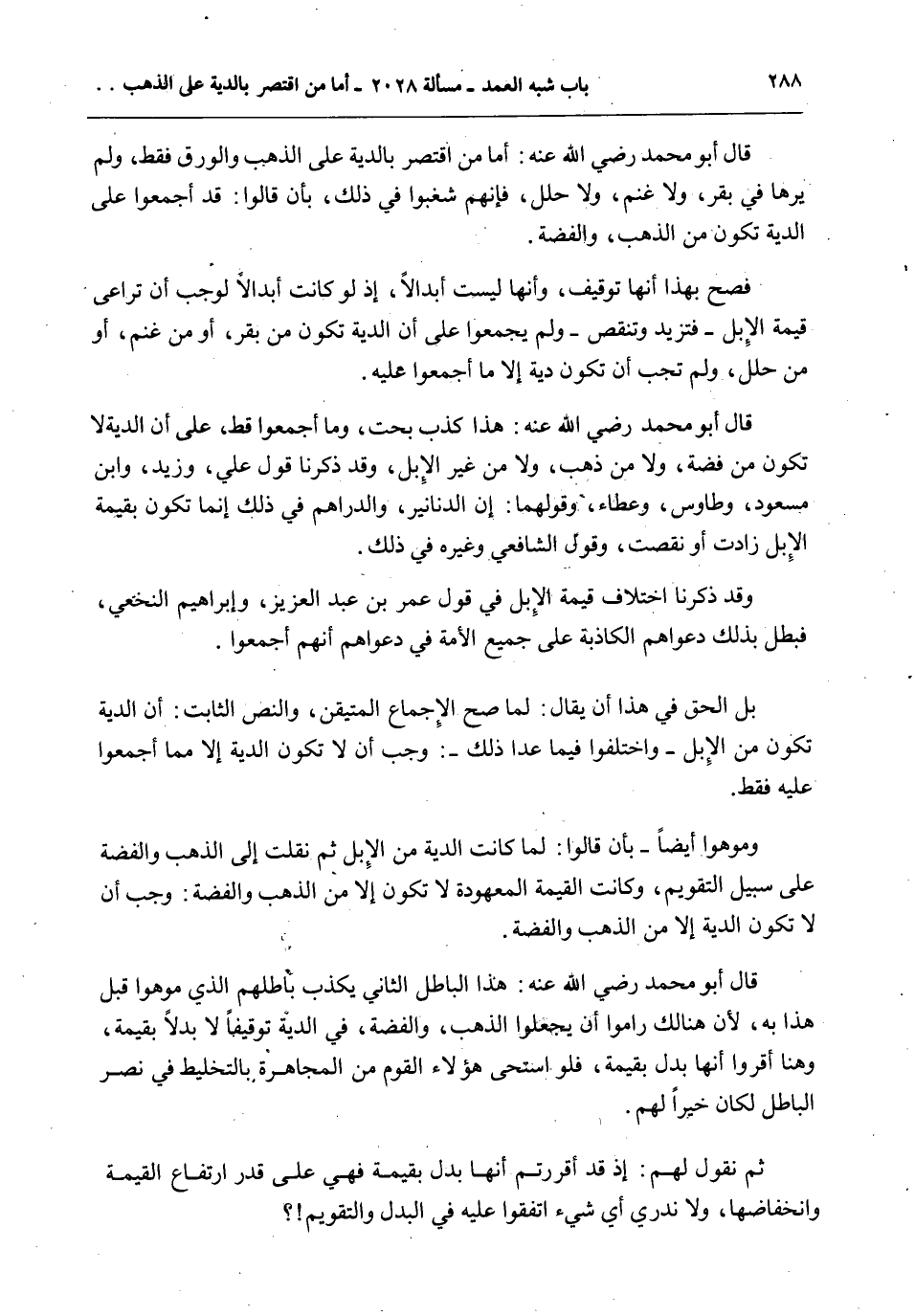 قَالَ أَبُو مُحَمَّدٍ - رَضِيَ اللَّهُ عَنْهُ -: أَمَّا مَنْ اقْتَصَرَ بِالدِّيَةِ عَلَى الذَّهَبِ وَالْوَرِقِ فَقَطْ، وَلَمْ يَرَهَا فِي بَقَرٍ، وَلَا غَنَمٍ، وَلَا حُلَلٍ، فَإِنَّهُمْ شَغَبُوا فِي ذَلِكَ، بِأَنْ قَالُوا: قَدْ أَجْمَعُوا عَلَى الدِّيَةِ تَكُونُ مِنْ الذَّهَبِ، وَالْفِضَّةِ.