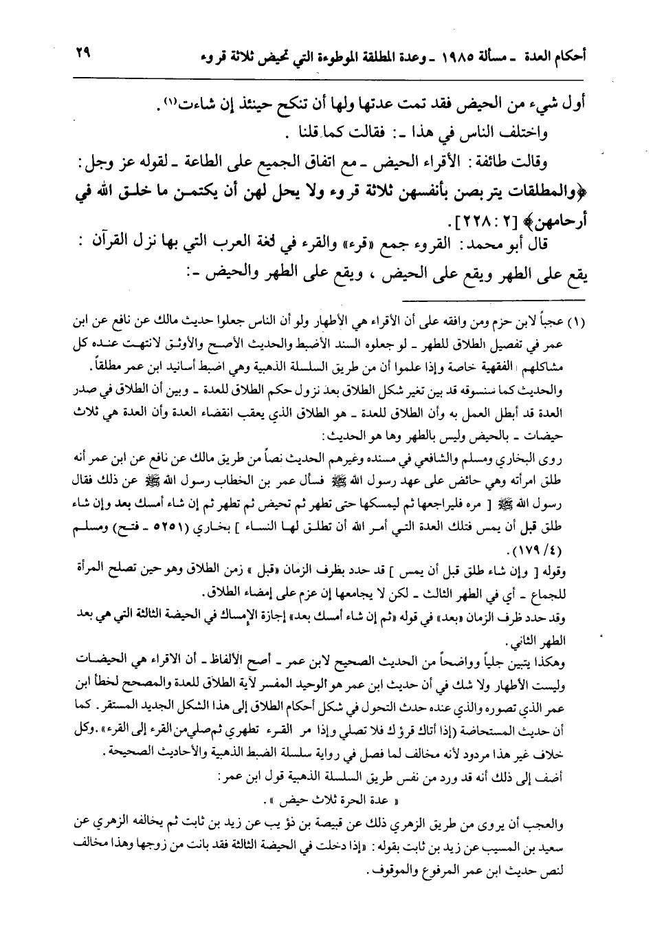 قَالَ أَبُو مُحَمَّدٍ: الْقُرُوءُ جَمْعُ " قُرْءٍ " وَالْقُرْءُ فِي لُغَةِ الْعَرَبِ الَّتِي بِهَا نَزَلَ الْقُرْآنُ: يَقَعُ عَلَى الطُّهْرِ وَيَقَعُ عَلَى الْحَيْضِ، وَيَقَعُ عَلَى الطُّهْرِ وَالْحَيْضِ -: