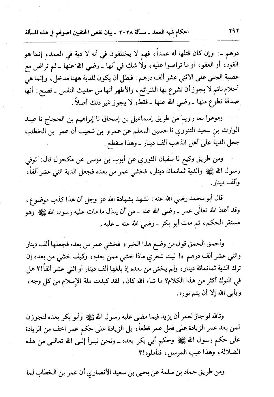 وَأَحْمَقُ الْحُمْقِ قَوْلُ مَنْ وَضَعَ هَذَا الْخَبَرَ " فَخَشِيَ عُمَرُ مَنْ بَعْدَهُ فَجَعَلَهَا أَلْفَ دِينَارٍ وَاثْنَيْ عَشَرَ أَلْفَ دِرْهَمٍ " لَيْتَ شِعْرِي مَاذَا خَشِيَ مِمَّنْ بَعْدَهُ، وَكَيْفَ خَشِيَ مَنْ بَعْدَهُ إنْ تَرَكَ الدِّيَةَ ثَمَانِمِائَةِ دِينَارٍ، وَلَمْ يَخْشَ مَنْ بَعْدَهُ إذْ بَلَغَهَا أَلْفَ دِينَارٍ أَوْ اثْنَيْ عَشَرَ أَلْفًا؟ هَلْ فِي النُّوكِ أَكْثَرُ مِنْ هَذَا الْكَلَامِ؟ مَا شَاءَ اللَّهُ كَانَ، لَقَدْ كِيدَتْ مِلَّةُ الْإِسْلَامِ مِنْ كُلِّ وَجْهٍ، وَيَأْبَى اللَّهُ إلَّا أَنْ يُتِمَّ نُورَهُ.