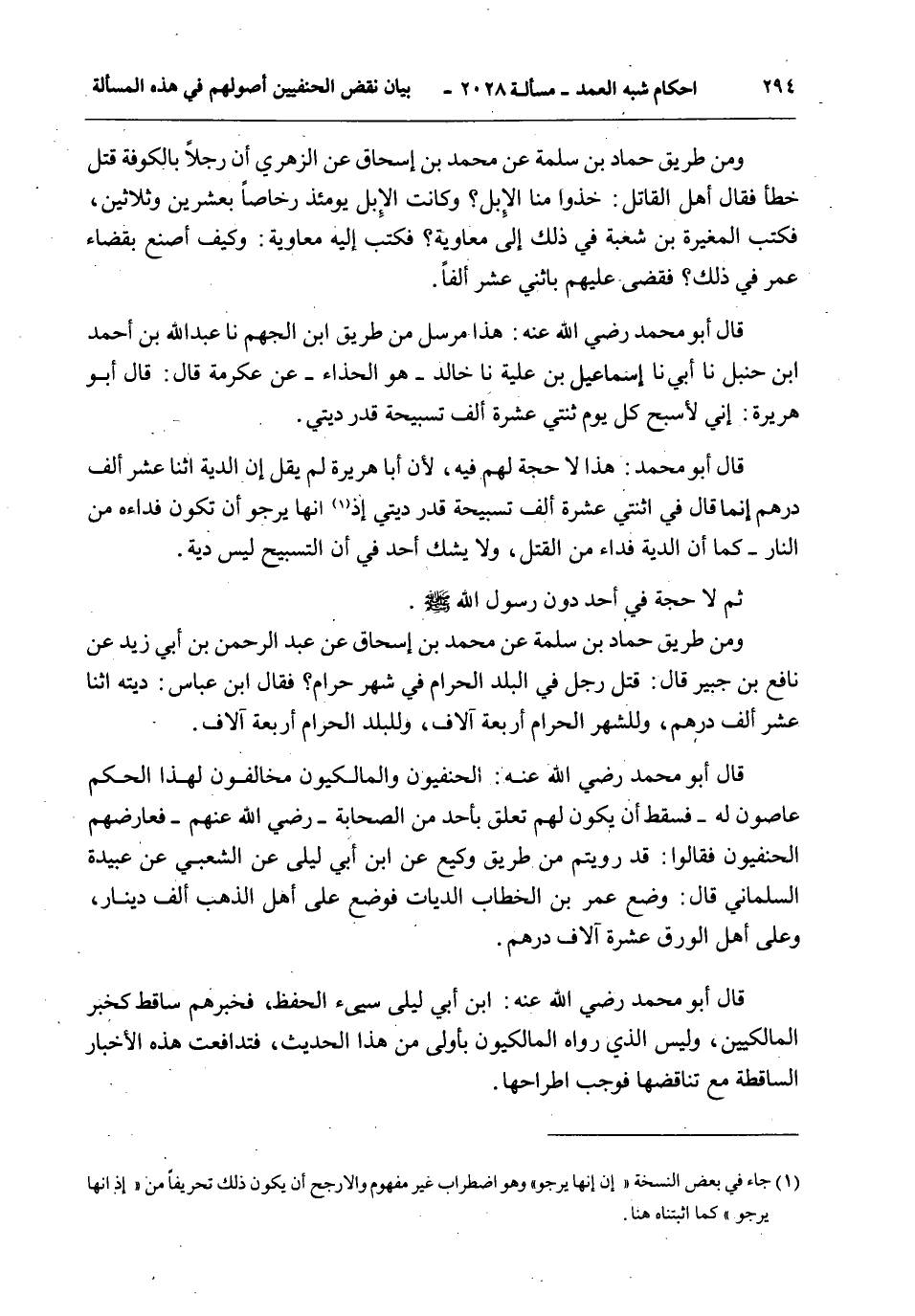 وَمِنْ طَرِيقِ حَمَّادِ بْنِ سَلَمَةَ عَنْ مُحَمَّدِ بْنِ إِسْحَاقَ عَنْ عَبْدِ الرَّحْمَنِ بْنِ أَبِي زَيْدٍ عَنْ نَافِعِ بْنِ جُبَيْرٍ قَالَ: قُتِلَ رَجُلٌ فِي الْبَلَدِ الْحَرَامِ فِي شَهْرٍ حَرَامٍ؟ فَقَالَ ابْنُ عَبَّاسٍ: دِيَتُهُ اثْنَا عَشَرَ أَلْفَ دِرْهَمٍ، وَلِلشَّهْرِ الْحَرَامِ أَرْبَعَةُ آلَافٍ، وَلِلْبَلَدِ الْحَرَامِ أَرْبَعَةُ آلَافٍ. قَالَ أَبُو مُحَمَّدٍ - رَضِيَ اللَّهُ عَنْهُ -: الْحَنَفِيُّونَ وَالْمَالِكِيُّونَ مُخَالِفُونَ لِهَذَا الْحُكْمِ عَاصُونَ لَهُ - فَسَقَطَ أَنْ يَكُونَ لَهُمْ تَعَلُّقٌ بِأَحَدٍ مِنْ الصَّحَابَةِ - رَضِيَ اللَّهُ عَنْهُمْ - فَعَارَضَهُمْ الْحَنَفِيُّونَ فَقَالُوا: قَدْ رَوَيْتُمْ مِنْ طَرِيقِ وَكِيعٍ عَنْ ابْنِ أَبِي لَيْلَى عَنْ الشَّعْبِيِّ عَنْ عَبِيدَةُ السَّلْمَانِيِّ قَالَ: وَضَعَ عُمَرُ بْنُ الْخَطَّابِ الدِّيَاتِ فَوَضَعَ عَلَى أَهْلِ الذَّهَبِ أَلْفَ دِينَارٍ، وَعَلَى أَهْلِ الْوَرِقِ عَشَرَةَ آلَافِ دِرْهَمٍ. قَالَ أَبُو مُحَمَّدٍ - رَضِيَ اللَّهُ عَنْهُ -: ابْنُ أَبِي لَيْلَى سَيِّئُ الْحِفْظِ، فَخَبَرُهُمْ سَاقِطٌ كَخَبَرِ الْمَالِكِيِّينَ، وَلَيْسَ الَّذِي رَوَاهُ الْمَالِكِيُّونَ بِأَوْلَى مِنْ هَذَا الْحَدِيثِ، فَتَدَافَعَتْ هَذِهِ الْأَخْبَارُ السَّاقِطَةُ مَعَ تَنَاقُضِهَا فَوَجَبَ إطْرَاحُهَا.
