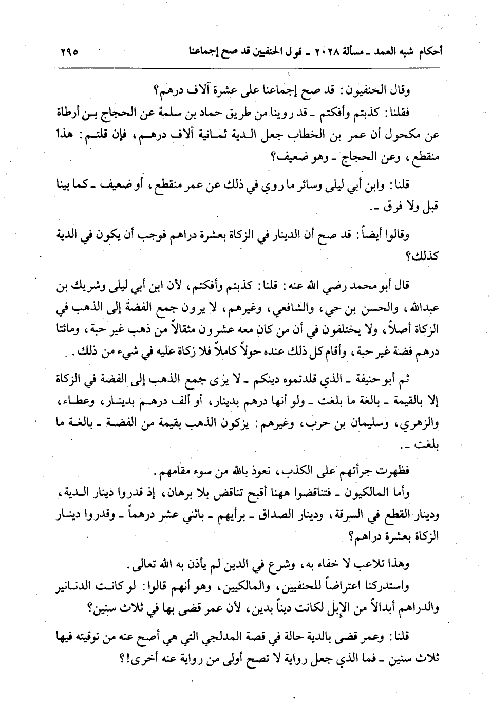 وَقَالَ الْحَنَفِيُّونَ: قَدْ صَحَّ إجْمَاعُنَا عَلَى عَشَرَةِ آلَافِ دِرْهَمٍ؟ فَقُلْنَا: كَذَبْتُمْ وَأَفَكْتُمْ - قَدْ رُوِّينَا مِنْ طَرِيقِ حَمَّادِ بْنِ سَلَمَةَ عَنْ الْحَجَّاجِ بْنِ أَرْطَاةَ عَنْ مَكْحُولٍ أَنَّ عُمَرَ بْنَ الْخَطَّابِ جَعَلَ الدِّيَةَ ثَمَانِيَةَ آلَافِ دِرْهَمٍ، فَإِنْ قُلْتُمْ: هَذَا مُنْقَطِعٌ، وَعَنْ الْحَجَّاجِ - وَهُوَ ضَعِيفٌ؟ قُلْنَا: وَابْنُ أَبِي لَيْلَى وَسَائِرُ مَا رُوِيَ فِي ذَلِكَ عَنْ عُمَرَ مُنْقَطِعٌ، أَوْ ضَعِيفٌ - كَمَا بَيَّنَّا قَبْلُ وَلَا فَرْقَ -.