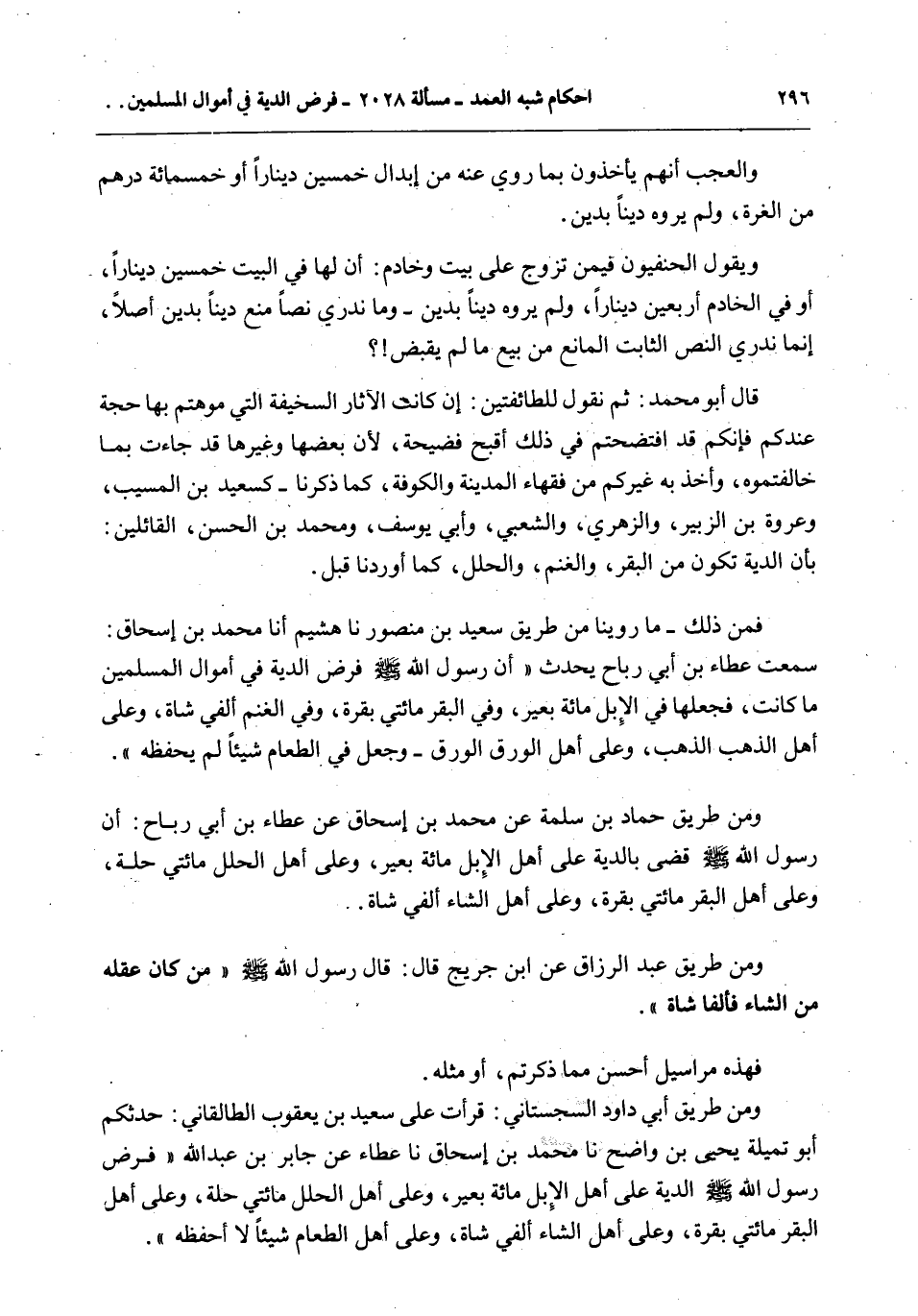 وَمِنْ طَرِيقِ حَمَّادِ بْنِ سَلَمَةَ عَنْ مُحَمَّدِ بْنِ إِسْحَاقَ عَنْ عَطَاءِ بْنِ أَبِي رَبَاحٍ: «أَنَّ رَسُولَ اللَّهِ - صَلَّى اللَّهُ عَلَيْهِ وَسَلَّمَ - قَضَى بِالدِّيَةِ عَلَى أَهْلِ الْإِبِلِ مِائَةَ بَعِيرٍ، وَعَلَى أَهْلِ الْحُلَلِ مِائَتَيْ حُلَّةٍ، وَعَلَى أَهْلِ الْبَقَرِ مِائَتَيْ بَقَرَةٍ، وَعَلَى أَهْلِ الشَّاءِ أَلْفَيْ شَاةٍ.» وَمِنْ طَرِيقِ عَبْدِ الرَّزَّاقِ عَنْ ابْنِ جُرَيْجٍ قَالَ: قَالَ رَسُولُ اللَّهِ - صَلَّى اللَّهُ عَلَيْهِ وَسَلَّمَ - «مَنْ كَانَ عَقْلُهُ مِنْ الشَّاءِ فَأَلْفَا شَاةٍ» .