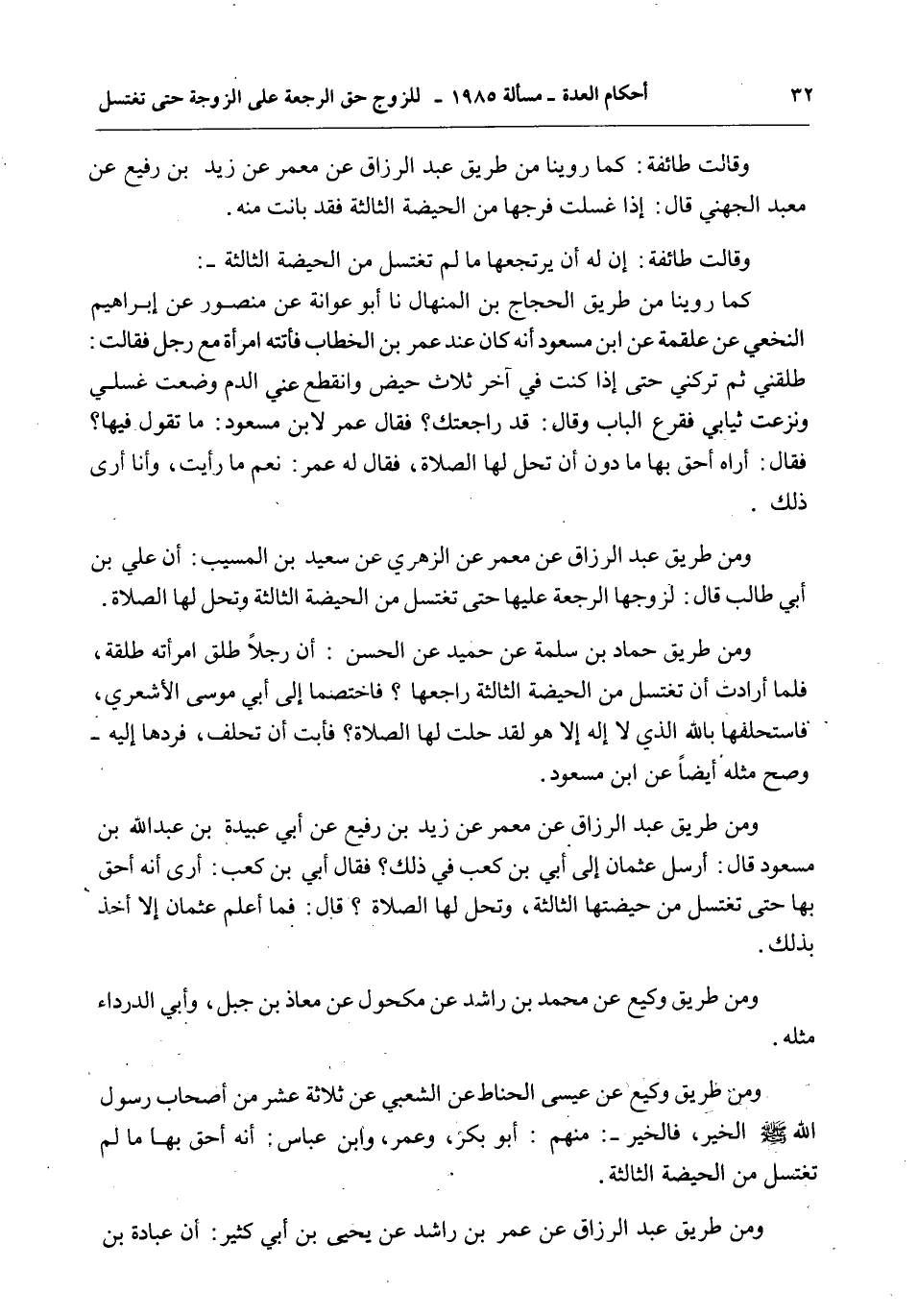 وَمِنْ طَرِيقِ عَبْدِ الرَّزَّاقِ عَنْ مَعْمَرٍ عَنْ زَيْدِ بْنِ رُفَيْعٍ عَنْ أَبِي عُبَيْدَةَ بْنِ عَبْدِ اللَّهِ بْنِ مَسْعُودٍ قَالَ: أَرْسَلَ عُثْمَانُ إلَى أُبَيِّ بْنِ كَعْبٍ فِي ذَلِكَ؟ فَقَالَ أُبَيّ بْنُ كَعْبٍ: أَرَى أَنَّهُ أَحَقُّ بِهَا حَتَّى تَغْتَسِلَ مِنْ حَيْضَتِهَا الثَّالِثَةِ، وَتَحِلَّ لَهَا الصَّلَاةُ؟ قَالَ: فَمَا أَعْلَمُ عُثْمَانَ إلَّا أَخَذَ بِذَلِكَ.