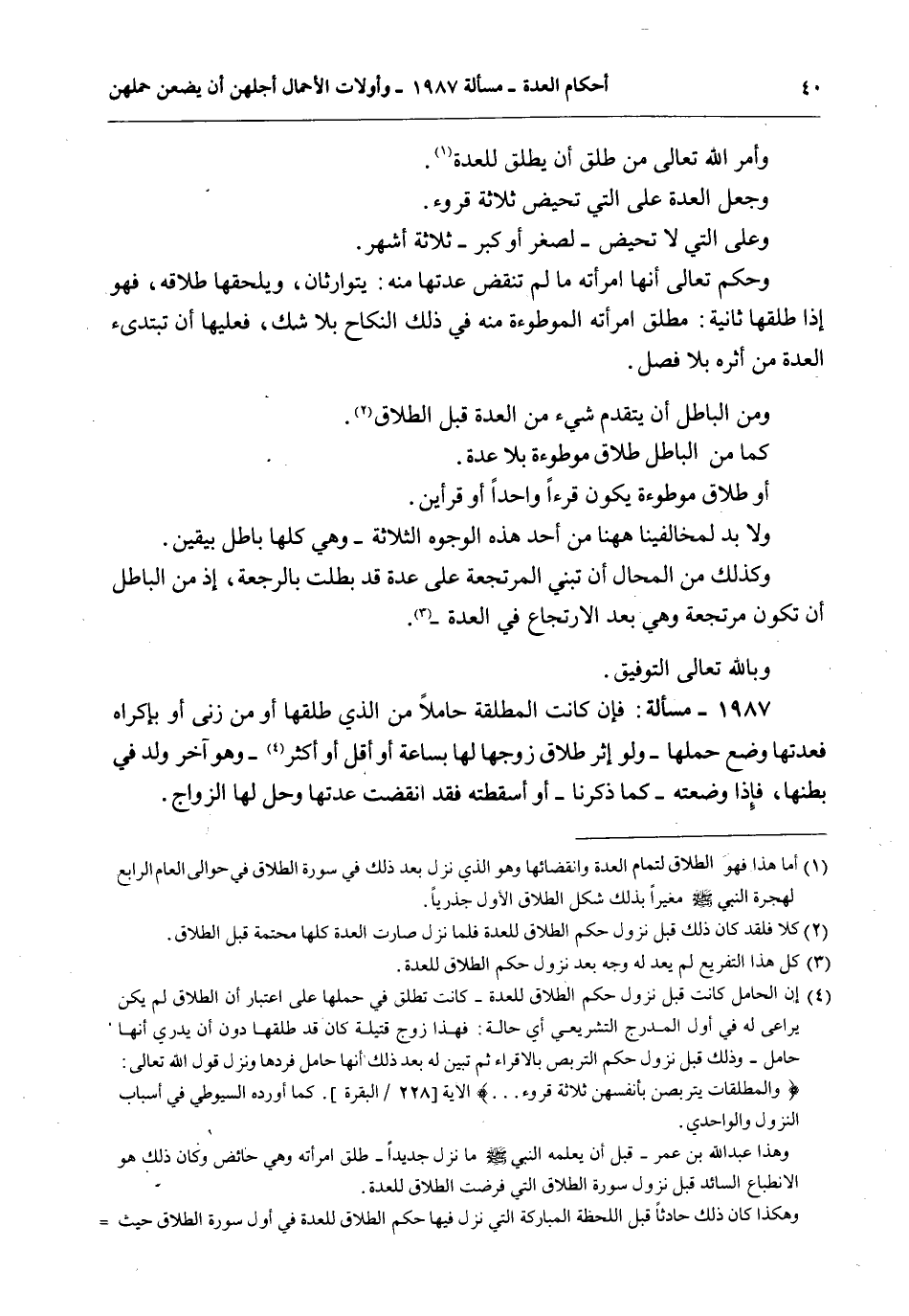 1987 - مَسْأَلَةٌ: فَإِنْ كَانَتْ الْمُطَلَّقَةُ حَامِلًا مِنْ الَّذِي طَلَّقَهَا أَوْ مِنْ زِنًى أَوْ بِإِكْرَاهٍ فَعِدَّتُهَا وَضْعُ حَمْلِهَا - وَلَوْ إثْرَ طَلَاقِ زَوْجِهَا لَهَا بِسَاعَةٍ أَوْ أَقَلَّ أَوْ أَكْثَرَ - وَهُوَ آخِرُ وَلَدٍ فِي بَطْنِهَا، فَإِذَا وَضَعَتْهُ - كَمَا ذَكَرْنَا - أَوْ أَسْقَطَتْهُ فَقَدْ انْقَضَتْ عِدَّتُهَا وَحَلَّ لَهَا الزَّوَاجُ.