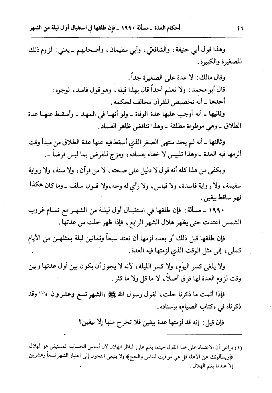 1990 - مَسْأَلَةٌ: فَإِنْ طَلَّقَهَا فِي اسْتِقْبَالِ أَوَّلِ لَيْلَةٍ مِنْ الشَّهْرِ مَعَ تَمَامِ غُرُوبِ الشَّمْسِ اعْتَدَّتْ حَتَّى يَظْهَرَ هِلَالُ الشَّهْرِ الرَّابِعِ، فَإِذَا ظَهَرَ حَلَّتْ مِنْ عِدَّتِهَا.