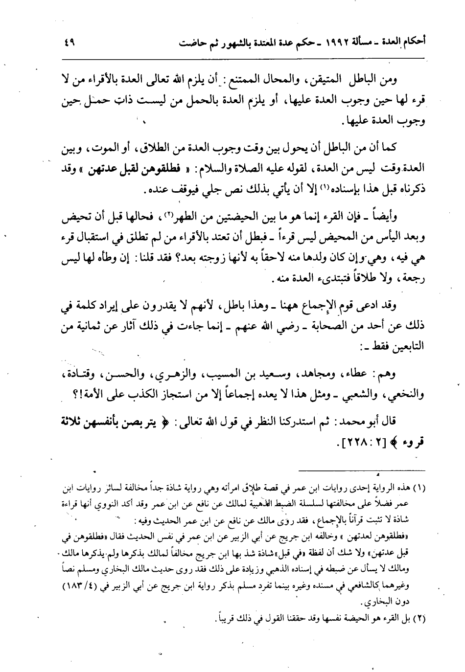 قَالَ أَبُو مُحَمَّدٍ: ثُمَّ اسْتَدْرَكْنَا النَّظَرَ فِي قَوْلِ اللَّهِ تَعَالَى: {يَتَرَبَّصْنَ بِأَنْفُسِهِنَّ ثَلاثَةَ قُرُوءٍ} [البقرة: 228]