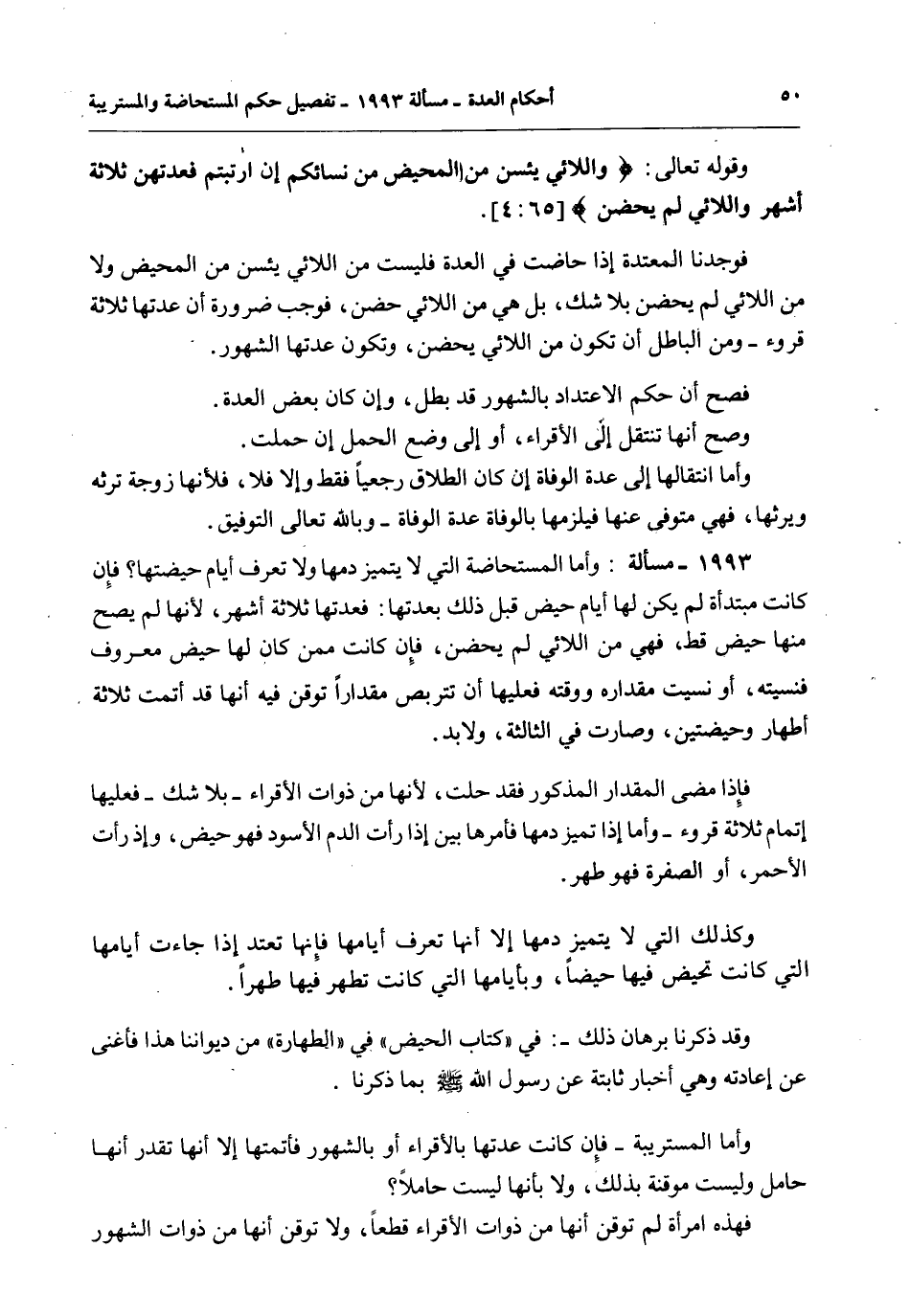 1993 - مَسْأَلَةٌ: وَأَمَّا الْمُسْتَحَاضَةُ الَّتِي لَا يَتَمَيَّزُ دَمُهَا وَلَا تَعْرِفُ أَيَّامَ حَيْضَتِهَا؟ فَإِنْ كَانَتْ مُبْتَدَأَةً لَمْ يَكُنْ لَهَا أَيَّامُ حَيْضٍ قَبْلَ ذَلِكَ بِعِدَّتِهَا: فَعِدَّتُهَا ثَلَاثَةُ أَشْهُرٍ، لِأَنَّهَا لَمْ يَصِحَّ مِنْهَا حَيْضٌ قَطُّ، فَهِيَ مِنْ اللَّائِي لَمْ يَحِضْنَ، فَإِنْ كَانَتْ مِمَّنْ كَانَ لَهَا حَيْضٌ مَعْرُوفٌ فَنَسِيَتْهُ، أَوْ نَسِيَتْ مِقْدَارَهُ وَوَقْتَهُ فَعَلَيْهَا أَنْ تَتَرَبَّصَ مِقْدَارًا تُوقِنُ فِيهِ أَنَّهَا قَدْ أَتَمَّتْ ثَلَاثَةَ أَطْهَارٍ وَحَيْضَتَيْنِ، وَصَارَتْ فِي الثَّالِثَةِ، وَلَا بُدَّ.