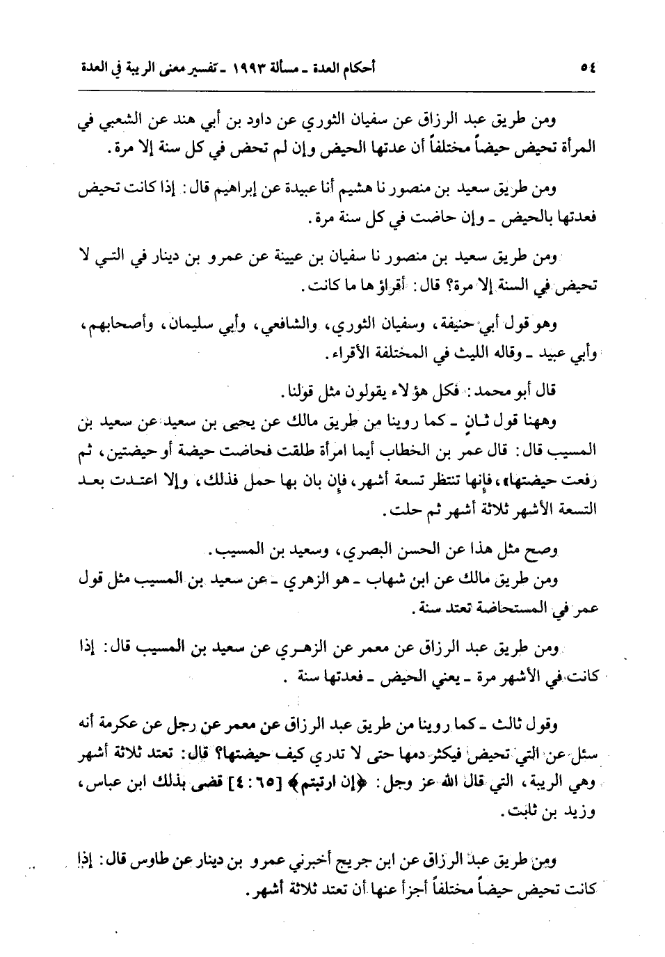 وَمِنْ طَرِيقِ عَبْدِ الرَّزَّاقِ عَنْ سُفْيَانَ الثَّوْرِيِّ عَنْ دَاوُد بْنِ أَبِي هِنْدَ عَنْ الشَّعْبِيِّ فِي الْمَرْأَةِ تَحِيضُ حَيْضًا مُخْتَلِفًا أَنَّ عِدَّتَهَا الْحَيْضُ، وَإِنْ لَمْ تَحِضْ فِي كُلِّ سَنَةٍ إلَّا مَرَّةً.