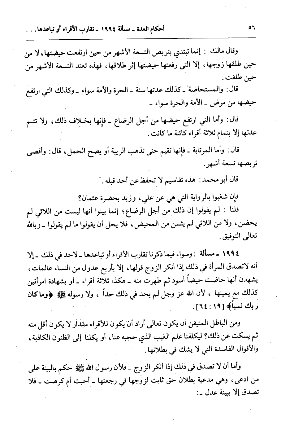 1994 - مَسْأَلَةٌ: وَسَوَاءٌ فِيمَا ذَكَرْنَا تَقَارُبُ الْأَقْرَاءِ أَوْ تَبَاعُدُهَا - لَا حَدَّ فِي ذَلِكَ - إلَّا أَنَّهُ لَا تُصَدَّقُ الْمَرْأَةُ فِي ذَلِكَ إذَا أَنْكَرَ الزَّوْجُ قَوْلَهَا، إلَّا بِأَرْبَعٍ عُدُولٍ مِنْ النِّسَاءِ عَالِمَاتٍ، يَشْهَدْنَ أَنَّهَا حَاضَتْ حَيْضًا أَسْوَدَ ثُمَّ طَهُرَتْ مِنْهُ - هَكَذَا ثَلَاثَةَ أَقْرَاءٍ - أَوْ بِشَهَادَةِ امْرَأَتَيْنِ كَذَلِكَ مَعَ يَمِينِهَا؛ لِأَنَّ اللَّهَ عَزَّ وَجَلَّ لَمْ يَحُدَّ فِي ذَلِكَ حَدًّا، وَلَا رَسُولُهُ - صَلَّى اللَّهُ عَلَيْهِ وَسَلَّمَ - {وَمَا كَانَ رَبُّكَ نَسِيًّا} [مريم: 64] .