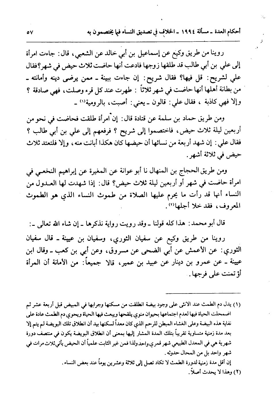 رُوِّينَا مِنْ طَرِيقِ وَكِيعٍ عَنْ إسْمَاعِيلَ بْنِ أَبِي خَالِدٍ عَنْ الشَّعْبِيِّ، قَالَ: جَاءَتْ امْرَأَةٌ إلَى عَلِيِّ بْنِ أَبِي طَالِبٍ قَدْ طَلَّقَهَا زَوْجُهَا فَادَّعَتْ أَنَّهَا حَاضَتْ ثَلَاثَةَ حِيَضٍ فِي الشَّهْرِ؟ فَقَالَ عَلِيٌّ لِشُرَيْحٍ: قُلْ فِيهَا؟ فَقَالَ شُرَيْحٌ: إنْ جَاءَتْ بِبَيِّنَةٍ - مِمَّنْ يُرْضَى دِينُهُ، وَأَمَانَتُهُ - مِنْ بِطَانَةِ أَهْلِهَا أَنَّهَا حَاضَتْ فِي شَهْرٍ ثَلَاثًا: طَهُرَتْ عِنْدَ كُلِّ قُرْءٍ وَصَلَّتْ، فَهِيَ صَادِقَةٌ؟ وَإِلَّا فَهِيَ كَاذِبَةٌ، فَقَالَ عَلِيٌّ: قالون - يَعْنِي: أَصَبْت بِالرُّومِيَّةِ.