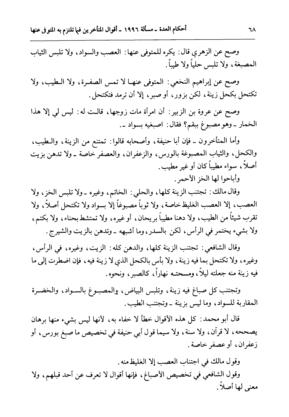 وَصَحَّ عَنْ الزُّهْرِيِّ قَالَ: يُكْرَهُ لِلْمُتَوَفَّى عَنْهَا: الْعَصْبُ وَالسَّوَادُ، وَلَا تَلْبَسُ الثِّيَابَ الْمُصْبَغَةَ، وَلَا تَلْبَسُ حُلِيًّا وَلَا طِيبًا.