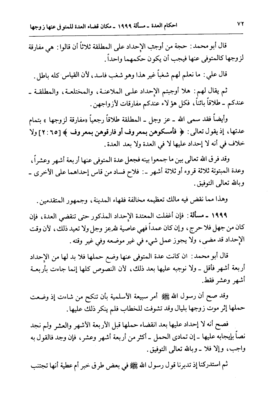 1999 - مَسْأَلَةٌ: فَإِنْ أَغْفَلَتْ الْمُعْتَدَّةُ الْإِحْدَادَ الْمَذْكُورَ حَتَّى تَنْقَضِيَ الْعِدَّةُ، فَإِنْ كَانَ مِنْ جَهْلٍ فَلَا حَرَجَ، وَإِنْ كَانَ عَمْدًا فَهِيَ عَاصِيَةٌ لِلَّهِ عَزَّ وَجَلَّ وَلَا تُعِيدُ ذَلِكَ؛ لِأَنَّ وَقْتَ الْإِحْدَادِ قَدْ مَضَى، وَلَا يَجُوزُ عَمَلُ شَيْءٍ فِي غَيْرِ مَوْضِعِهِ وَفِي غَيْرِ وَقْتِهِ.