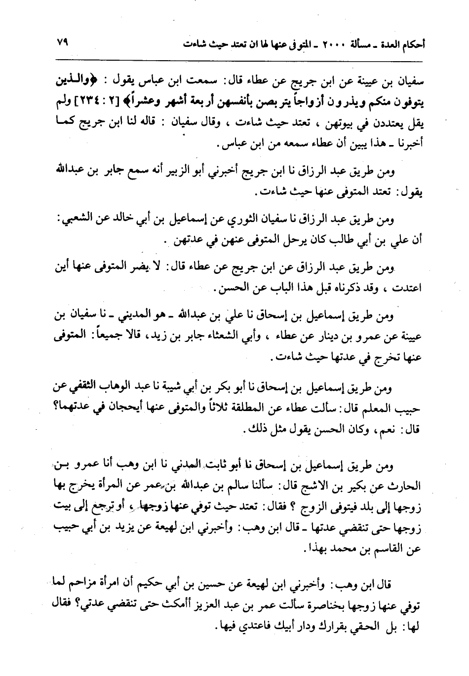 سُفْيَانُ بْنُ عُيَيْنَةَ عَنْ ابْنِ جُرَيْجٍ عَنْ عَطَاءٍ قَالَ: سَمِعْت ابْنَ عَبَّاسٍ يَقُولُ: {وَالَّذِينَ يُتَوَفَّوْنَ مِنْكُمْ وَيَذَرُونَ أَزْوَاجًا يَتَرَبَّصْنَ بِأَنْفُسِهِنَّ أَرْبَعَةَ أَشْهُرٍ وَعَشْرًا} [البقرة: 234] وَلَمْ يَقُلْ يَعْتَدِدْنَ فِي بُيُوتِهِنَّ، تَعْتَدُّ حَيْثُ شَاءَتْ، وَقَالَ سُفْيَانُ: قَالَهُ لَنَا ابْنُ جُرَيْجٍ كَمَا أَخْبَرَنَا - هَذَا يُبَيِّنُ أَنَّ عَطَاءً سَمِعَهُ مِنْ ابْنِ عَبَّاسٍ.