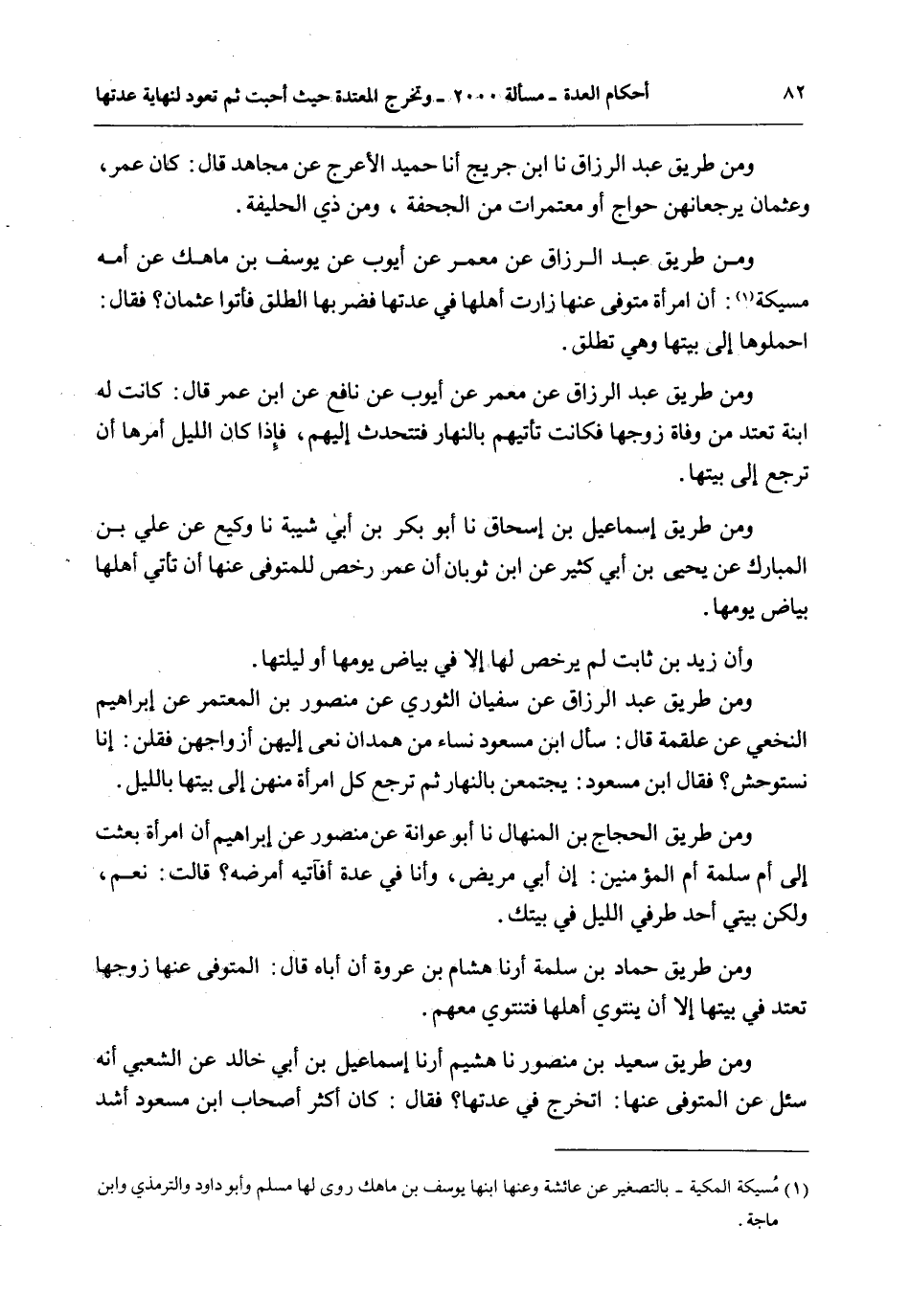 وَمِنْ طَرِيقِ عَبْدِ الرَّزَّاقِ عَنْ مَعْمَرٍ عَنْ أَيُّوبَ عَنْ يُوسُفَ بْنِ مَاهَكَ عَنْ أُمِّهِ مُسَيْكَةَ: أَنَّ امْرَأَةً مُتَوَفَّى عَنْهَا زَارَتْ أَهْلَهَا فِي عِدَّتِهَا فَضَرَبَهَا الطَّلْقُ فَأَتَوْا عُثْمَانَ؟ فَقَالَ: احْمِلُوهَا إلَى بَيْتِهَا وَهِيَ تُطْلِقُ.