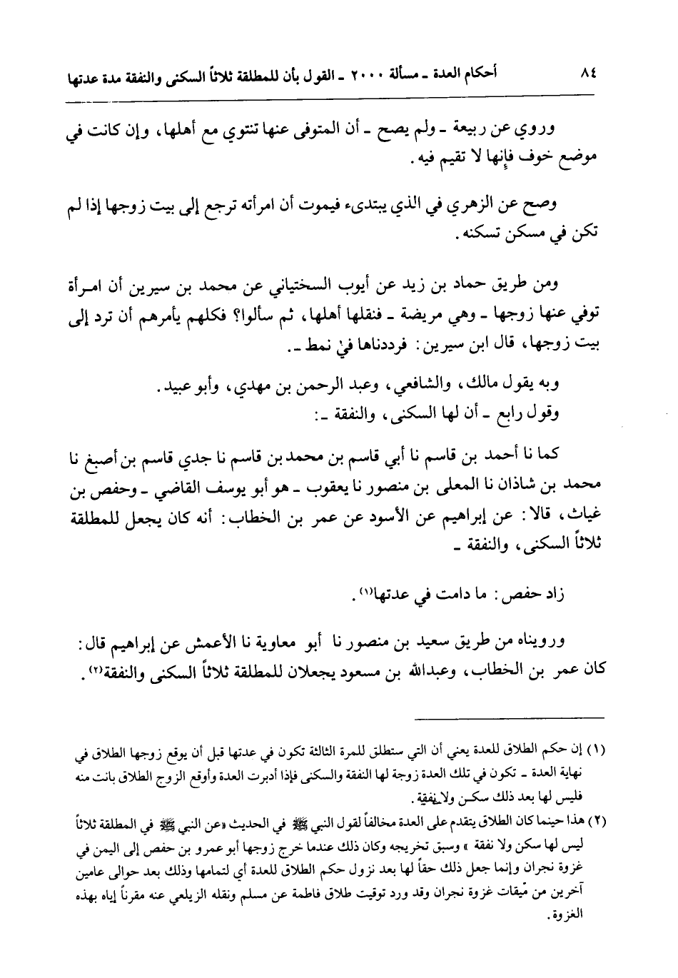 وَقَوْلٌ رَابِعٌ - أَنَّ لَهَا السُّكْنَى، وَالنَّفَقَةَ -: كَمَا أَنَا أَحْمَدُ بْنُ قَاسِمٍ أَنَا أَبِي قَاسِمُ بْنُ مُحَمَّدِ بْنِ قَاسِمٍ أَنَا جَدِّي قَاسِمُ بْنُ أَصْبَغَ أَنَا مُحَمَّدُ بْنُ شَاذَانَ أَنَا الْمُعَلَّى بْنُ مَنْصُورٍ أَنَا يَعْقُوبُ - هُوَ أَبُو يُوسُفَ الْقَاضِي - وَحَفْصُ بْنُ غِيَاثٍ، قَالَا: عَنْ إبْرَاهِيمَ عَنْ الْأَسْوَدِ عَنْ عُمَرَ بْنِ الْخَطَّابِ: أَنَّهُ كَانَ يَجْعَلُ لِلْمُطَلَّقَةِ ثَلَاثًا السُّكْنَى، وَالنَّفَقَةَ - زَادَ حَفْصٌ: مَا دَامَتْ فِي عِدَّتِهَا.