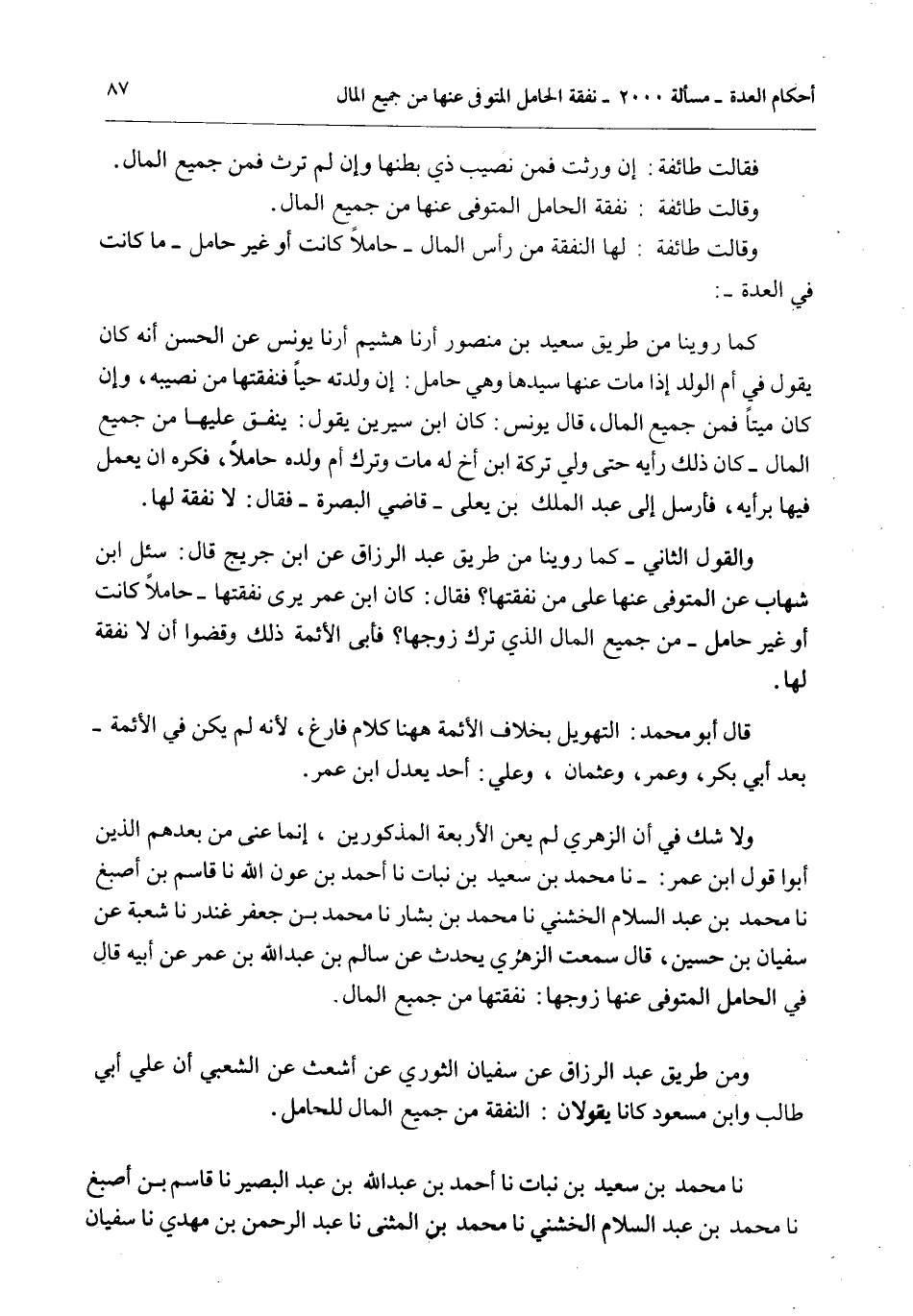 وَلَا شَكَّ فِي أَنَّ الزُّهْرِيَّ لَمْ يَعْنِ الْأَرْبَعَةَ الْمَذْكُورِينَ، إنَّمَا عَنَى مَنْ بَعْدَهُمْ الَّذِينَ أَبَوْا قَوْلَ ابْنِ عُمَرَ: - أَنَا مُحَمَّدُ بْنُ سَعِيدِ بْنِ نُبَاتٍ أَنَا أَحْمَدُ بْنُ عَوْنِ اللَّهِ أَنَا قَاسِمُ بْنُ أَصْبَغَ أَنَا مُحَمَّدُ بْنُ عَبْدِ السَّلَامِ الْخُشَنِيُّ أَنَا مُحَمَّدُ بْنُ بَشَّارٍ أَنَا مُحَمَّدُ بْنُ جَعْفَرَ غُنْدَرٌ أَنَا شُعْبَةُ عَنْ سُفْيَانَ بْنِ حُسَيْنٍ، قَالَ سَمِعْت الزُّهْرِيَّ يُحَدِّثُ عَنْ سَالِمِ بْنِ عَبْدِ اللَّهِ بْنِ عُمَرَ عَنْ أَبِيهِ قَالَ فِي الْحَامِلِ الْمُتَوَفَّى عَنْهَا زَوْجُهَا: نَفَقَتُهَا مِنْ جَمِيعِ الْمَالِ.