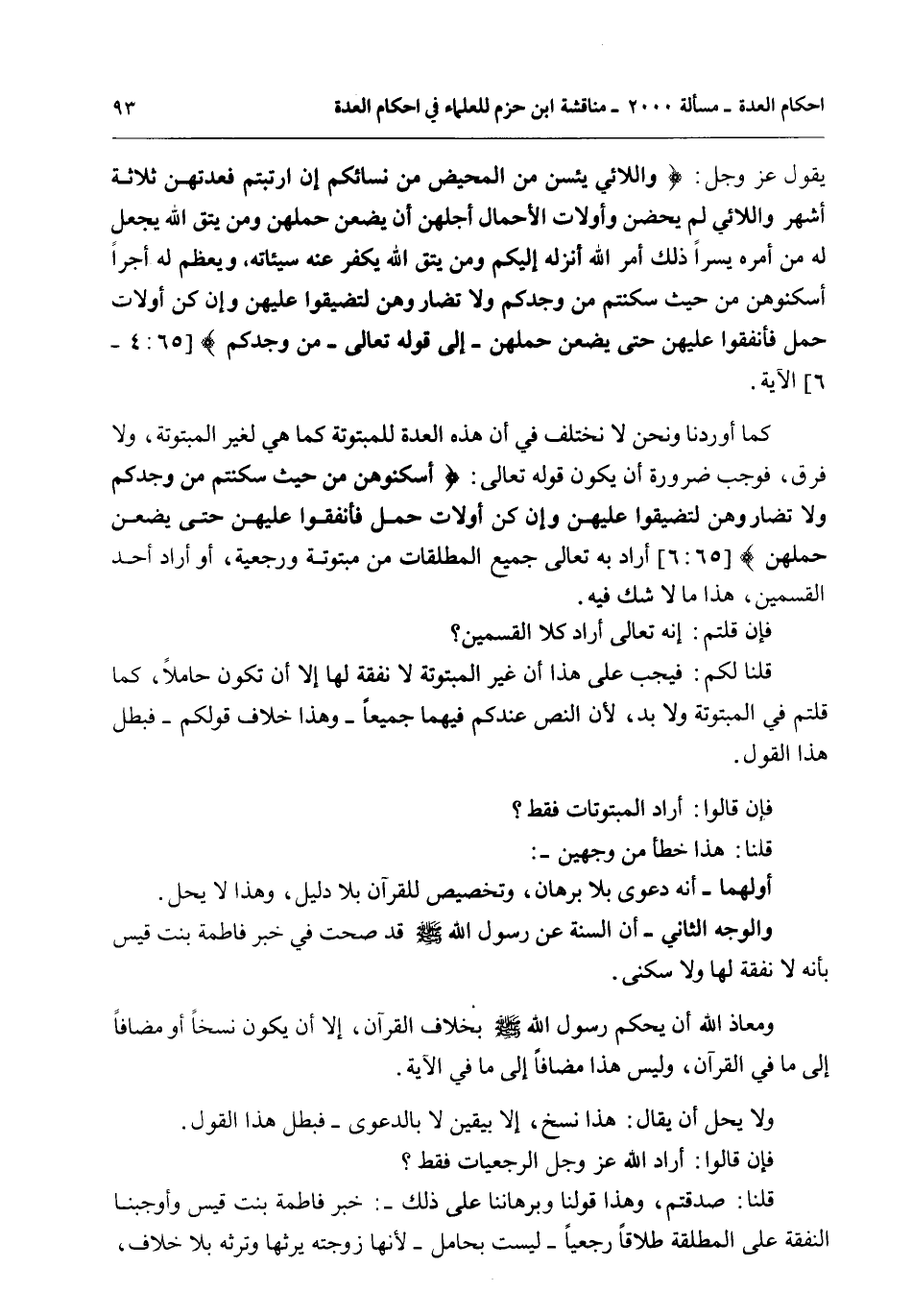 كَمَا أَوْرَدْنَا وَنَحْنُ لَا نَخْتَلِفُ فِي أَنَّ هَذِهِ الْعِدَّةَ لِلْمَبْتُوتَةِ كَمَا هِيَ لِغَيْرِ الْمَبْتُوتَةِ، وَلَا فَرْقَ، فَوَجَبَ ضَرُورَةً أَنْ يَكُونَ قَوْله تَعَالَى: {أَسْكِنُوهُنَّ مِنْ حَيْثُ سَكَنْتُمْ مِنْ وُجْدِكُمْ وَلا تُضَارُّوهُنَّ لِتُضَيِّقُوا عَلَيْهِنَّ وَإِنْ كُنَّ أُولاتِ حَمْلٍ فَأَنْفِقُوا عَلَيْهِنَّ حَتَّى يَضَعْنَ حَمْلَهُنَّ} [الطلاق: 6] أَرَادَ بِهِ تَعَالَى جَمِيعَ الْمُطَلَّقَاتِ مِنْ مَبْتُوتَةٍ وَرَجْعِيَّةٍ، أَوْ أَرَادَ أَحَدَ الْقِسْمَيْنِ، هَذَا مَا لَا شَكَّ فِيهِ.