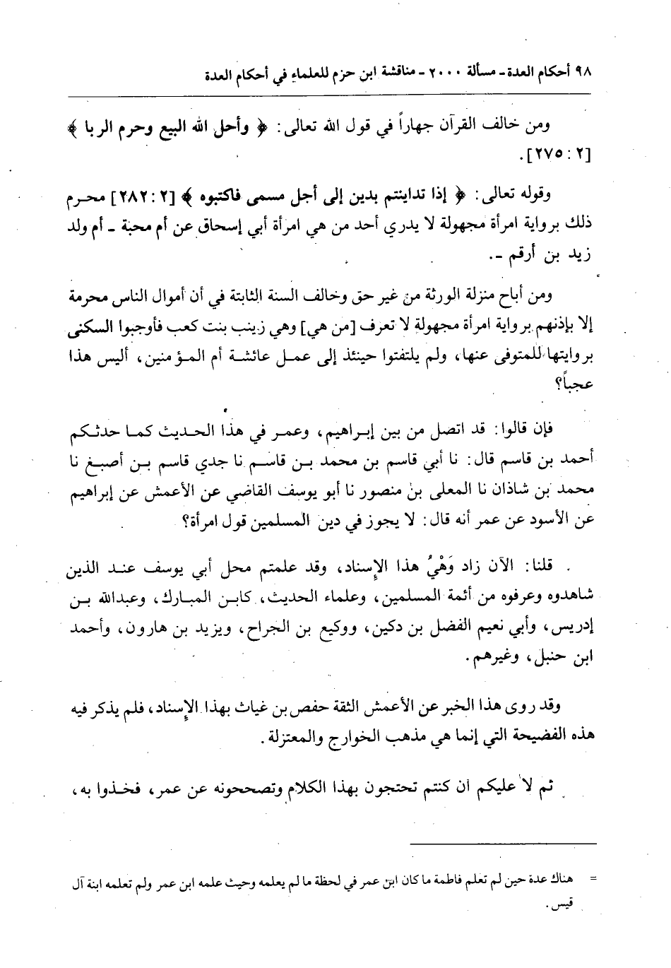 وَمَنْ أَبَاحَ مَنْزِلَةَ الْوَرَثَةِ مِنْ غَيْرِ حَقٍّ وَخَالَفَ السُّنَّةَ الثَّابِتَةَ فِي أَنَّ أَمْوَالَ النَّاسِ مُحَرَّمَةٌ إلَّا بِإِذْنِهِمْ بِرِوَايَةِ امْرَأَةٍ مَجْهُولَةٍ لَا تُعْرَفُ [مَنْ هِيَ] وَهِيَ زَيْنَبُ بِنْتُ كَعْبٍ فَأَوْجَبُوا السُّكْنَى بِرِوَايَتِهَا لِلْمُتَوَفَّى عَنْهَا، وَلَمْ يَلْتَفِتُوا حِينَئِذٍ إلَى عَمَلِ عَائِشَةَ أُمِّ الْمُؤْمِنِينَ، أَلَيْسَ هَذَا عَجَبًا؟ فَإِنْ قَالُوا: قَدْ اتَّصَلَ مِنْ بَيْنِ إبْرَاهِيمَ، وَعُمَرَ فِي هَذَا الْحَدِيثِ كَمَا حَدَّثَكُمْ أَحْمَدُ بْنُ قَاسِمٍ قَالَ: أَنَا أَبِي قَاسِمُ بْنُ مُحَمَّدِ بْنِ قَاسِمٍ أَنَا جَدِّي قَاسِمُ بْنُ أَصْبَغَ أَنَا مُحَمَّدُ بْنُ شَاذَانَ أَنَا الْمُعَلَّى بْنُ مَنْصُورٍ أَنَا أَبُو يُوسُفَ الْقَاضِي عَنْ الْأَعْمَشِ عَنْ إبْرَاهِيمَ عَنْ الْأَسْوَدِ عَنْ عُمَرَ أَنَّهُ قَالَ: لَا يَجُوزُ فِي دِينِ الْمُسْلِمِينَ قَوْلُ امْرَأَةٍ؟ قُلْنَا: الْآنَ زَادَ وَهْيُ هَذَا الْإِسْنَادِ، وَقَدْ عَلِمْتُمْ مَحَلَّ أَبِي يُوسُفَ عِنْدَ الَّذِينَ شَاهَدُوهُ وَعَرَفُوهُ مِنْ أَئِمَّةِ الْمُسْلِمِينَ، وَعُلَمَاءِ الْحَدِيثِ، كَابْنِ الْمُبَارَكِ، وَعَبْدِ اللَّهِ بْنِ إدْرِيسَ، وَأَبِي نُعَيْمٍ الْفَضْلِ بْنِ دُكَيْنٍ، وَوَكِيعِ بْنِ الْجَرَّاحِ، وَيَزِيدَ بْنِ هَارُونَ، وَأَحْمَدَ بْنِ حَنْبَلٍ، وَغَيْرِهِمْ.