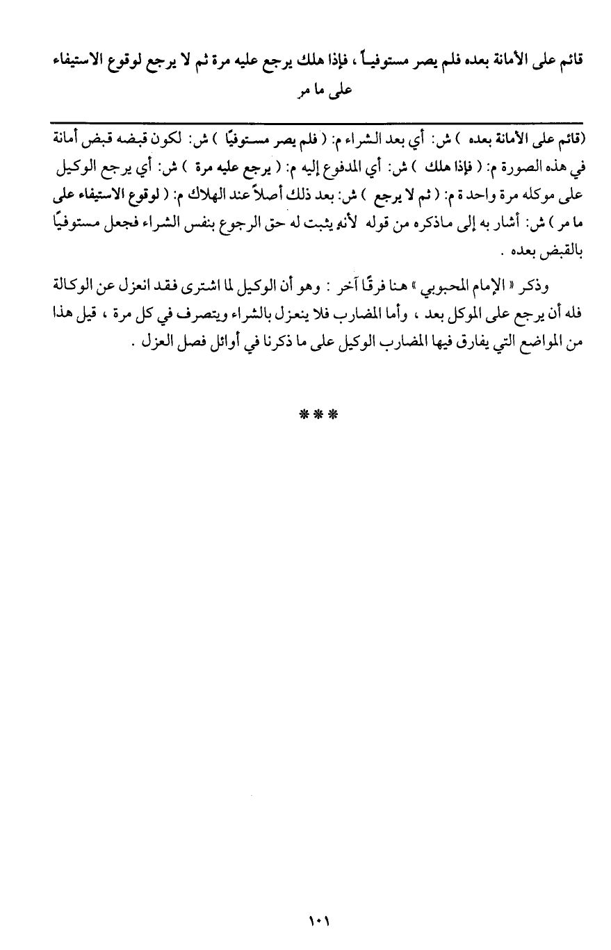 وذكر " الإمام المحبوبي " هنا فرقًا آخر وهو أن الوكيل لما اشترى فقد انعزل عن الوكالة فله أن يرجع على الموكل بعد، وأما المضارب فلا ينعزل بالشراء ويتصرف في كل مرة، قيل هذا من المواضع التي يفارق فيها المضارب الوكيل على ما ذكرنا في أوائل فصل العزل.