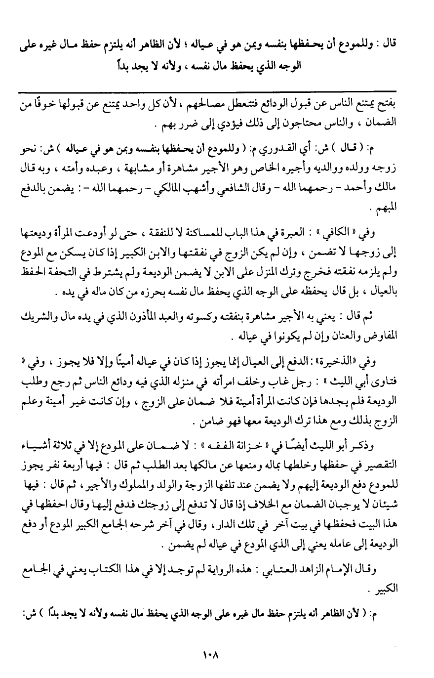 وفي " الكافي ": العبرة في هذا الباب للمساكنة لا للنفقة، حتى لو أودعت المرأة وديعتها إلى زوجها لا تضمن، وإن لم يكن الزوج في نفقتها والابن الكبير إذا كان يسكن مع المودع ولم يلزمه نفقته فخرج وترك المنزل على الابن لا يضمن الوديعة ولم يشترط في التحفة الحفظ بالعيال، بل قال يحفظه على الوجه الذي يحفظ مال نفسه بحرزه من كان ماله في يده.