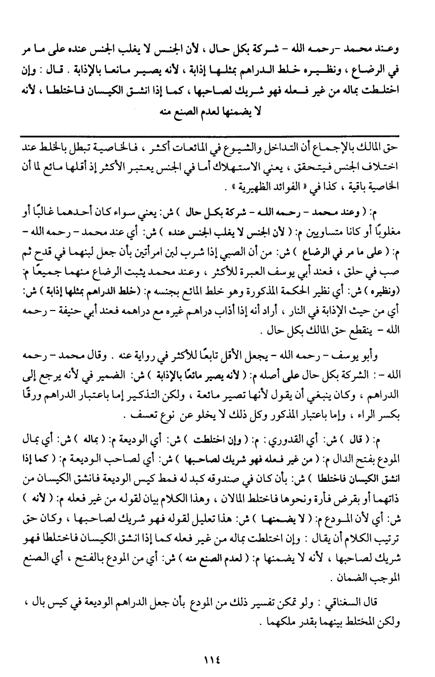 ـــــــــــــــــــــــــــــQحق المالك بالإجماع أن التداخل والشيوع في المائعات أكثر، فالخاصية تبطل بالخلط عند اختلاف الجنس فيتحقق، يعني الاستهلاك أما في الجنس يعتبر الأكثر إذ أقلها مائع لما أن الخاصية باقية، كذا في " الفوائد الظهيرية ".