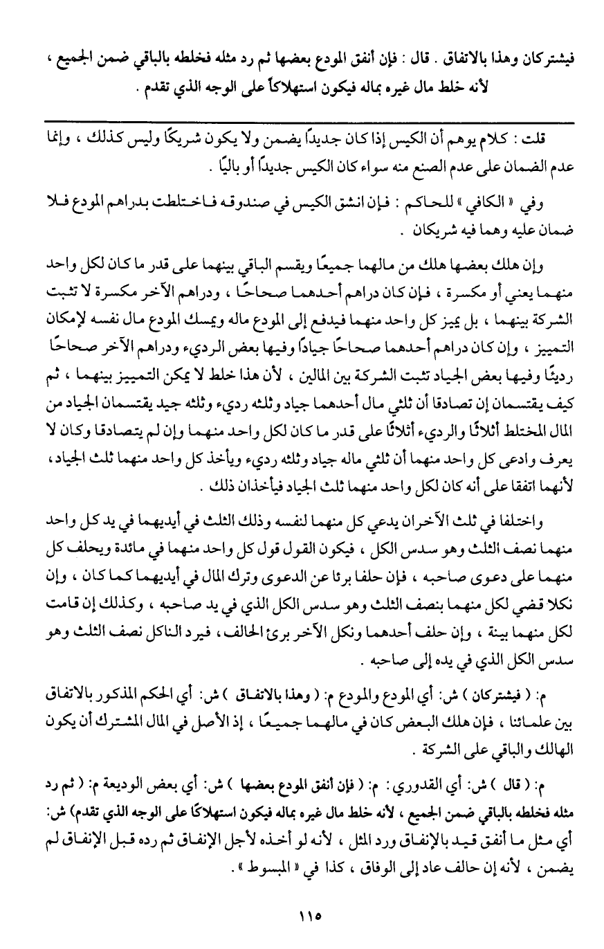 وإن هلك بعضها هلك من مالهما جميعاً ويقسم الباقي بينهما على قدر ما كان لكل واحد منهما يعني أو مكسرة، فإن كان دراهم أحدهما صحاحا، ودراهم الآخر مكسرة لا تثبت الشركة بينهما، بل يميز كل واحد منهما فيدفع إلى المودع ماله ويمسك المودع مال نفسه لإمكان التمييز، وإن كان دراهم أحدهما صحاحا جيادا وفيها بعض الرديء ودراهم الآخر صحاحا رديئا وفيها بعض الجياد تثبت الشركة بين المالين، لأن هذا خلط لا يمكن التمييز بينهما، ثم كيف يقتسمان إن تصادقا أن ثلثي مال أحدهما جياد وثلثه رديء وثلثه جيد يقتسمان الجياد من المال المختلط أثلاثا والرديء أثلاثًا على قدر ما كان لكل واحد منهما وإن لم يتصادقا وكان لا يعرف وادعى كل واحد منهما أن ثلثي ماله جياد وثلثه رديء ويأخذ كل واحد منهما ثلث الجياد، لأنهما اتفقا على أنه كان لكل واحد منهما ثلث الجياد فيأخذان ذلك.