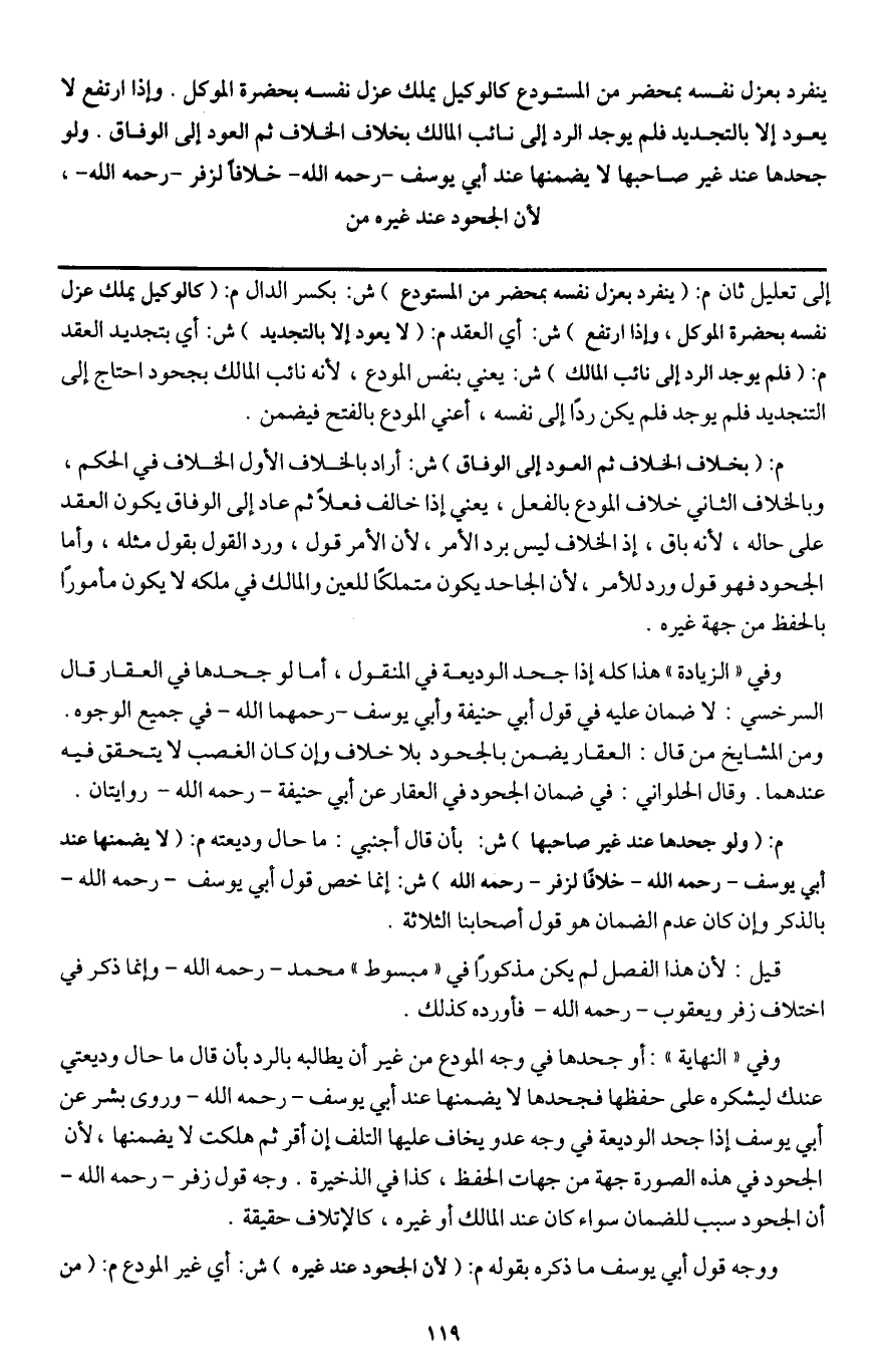 ينفرد بعزل نفسه بمحضر من المستودع كالوكيل يملك عزل نفسه بحضرة الموكل. وإذا ارتفع لا يعود إلا بالتجديد فلم يوجد الرد إلى نائب المالك بخلاف الخلاف ثم العود إلى الوفاق. ولو جحدها عند غير صاحبها لا يضمنها عند أبي يوسف - رَحِمَهُ اللَّهُ - خلافا لزفر - رَحِمَهُ اللَّهُ -؛ لأن الجحود عند غيره من