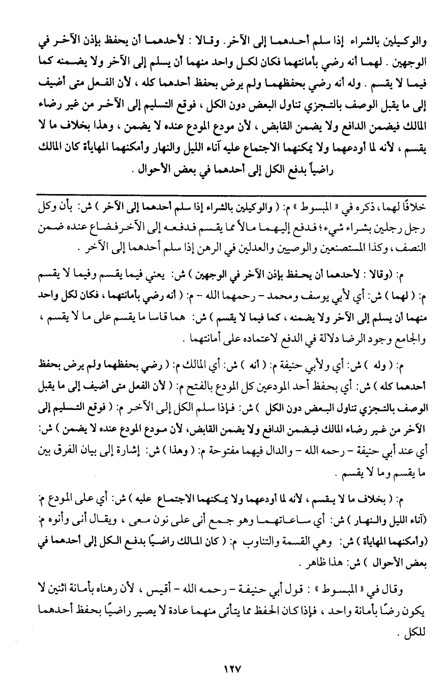 والوكيلين بالشراء إذا سلم أحدهما إلى الآخر. وقالا: لأحدهما أن يحفظ بإذن الآخر في الوجهين. لهما أنه رضي بأمانتهما فكان لكل واحد منهما أن يسلم إلى الآخر ولا يضمنه كما فيما لا يقسم. وله أنه رضي بحفظهما ولم يرض بحفظ أحدهما كله؛ لأن الفعل متى أضيف إلى ما يقبل الوصف بالتجزي تناول البعض دون الكل، فوقع التسليم إلى الآخر من غير رضاء المالك فيضمن الدافع ولا يضمن القابض؛ لأن مودع المودع عنده لا يضمن، وهذا بخلاف ما لا يقسم؛ لأنه لما أودعهما ولا يمكنهما الاجتماع عليه آناء الليل والنهار وأمكنهما المهايأة كان المالك راضيا بدفع الكل إلى أحدهما في بعض الأحوال.