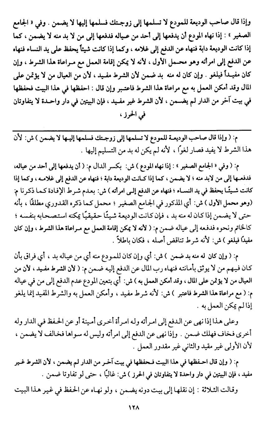 وإذا قال صاحب الوديعة للمودع لا تسلمها إلى زوجتك فسلمها إليها لا يضمن. وفي " الجامع الصغير ": إذا نهاه المودع أن يدفعها إلى أحد من عياله فدفعها إلى من لا بد منه لا يضمن، كما إذا كانت الوديعة دابة فنهاه عن الدفع إلى غلامه، وكما إذا كانت شيئا يحفظ على يد النساء فنهاه عن الدفع إلى امرأته وهو محمل الأول؛ لأنه لا يمكن إقامة العمل مع مراعاة هذا الشرط، وإن كان مفيدا فيلغو. وإن كان له منه بد ضمن لأن الشرط مفيد؛ لأن من العيال من لا يؤتمن على المال وقد أمكن العمل به مع مراعاة هذا الشرط فاعتبر وإن قال: احفظها في هذا البيت فحفظها في بيت آخر من الدار لم يضمن؛ لأن الشرط غير مفيد، فإن البيتين في دار واحدة لا يتفاوتان في الحرز.