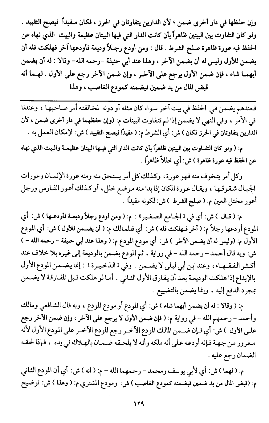 ـــــــــــــــــــــــــــــQفعندهم يضمن في الحفظ في بيت آخر سواء كان مثله أو دونه لمخالفته أمر صاحبها، وعندنا في الأمر، وفي النهي لا يضمن إذا لم تتفاوت البينات م: (وإن حفظهما في دار أخرى ضمن، لأن الدارين يتفاوتان في الحرز فكان) ش: أي الشرط م: (مفيدًا فيصح التقييد) ش: لإمكان العمل به.