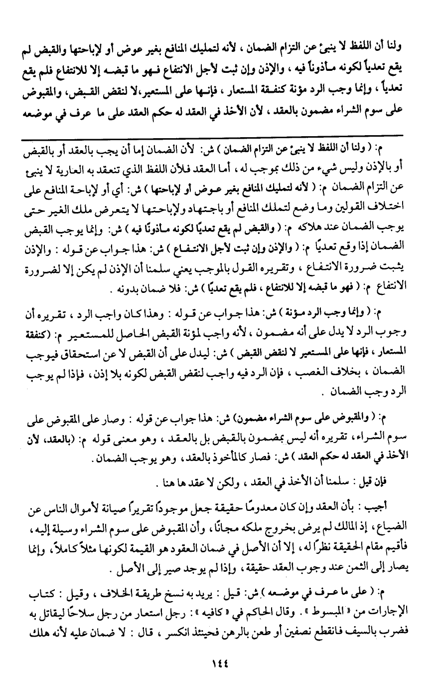ولنا أن اللفظ لا ينبئ عن التزام الضمان؛ لأنه لتمليك المنافع بغير عوض أو لإباحتها والقبض لم يقع تعديا لكونه مأذونا فيه، والإذن وإن ثبت لأجل الانتفاع فهو ما قبضه إلا للانتفاع فلم يقع تعديا، وإنما وجب الرد مؤنة كنفقة المستعار، فإنها على المستعير، لا لنقض القبض، والمقبوض على سوم الشراء مضمون بالعقد؛ لأن الأخذ في العقد له حكم العقد على ما عرف في موضعه