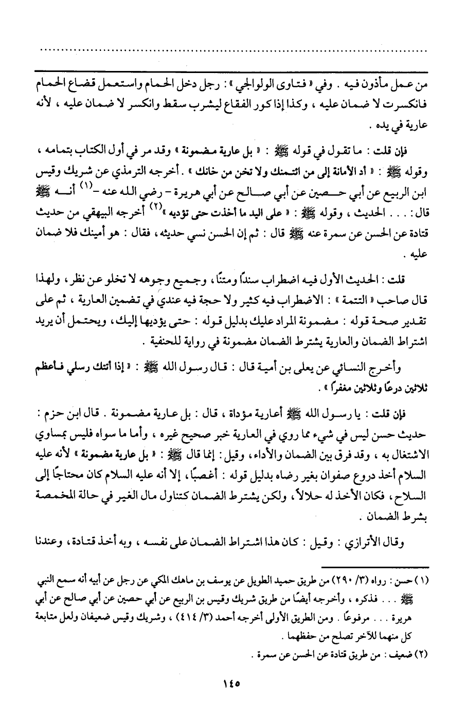 قلت: الحديث الأول فيه اضطراب سندًا ومتنًا، وجميع وجوهه لا تخلو عن نظر، ولهذا قال صاحب " التتمة ": الاضطراب فيه كثير ولا حجة فيه عندي في تضمين العارية، ثم على تقدير صحة قوله: مضمونة المراد عليك بدليل قوله: حتى يؤديها إليك، ويحتمل أن يريد اشتراط الضمان والعارية يشترط الضمان مضمونة في رواية للحنفية.