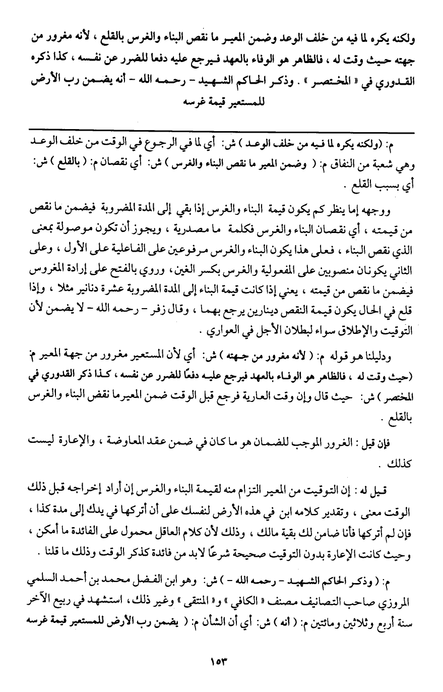 م: (وذكر الحاكم الشهيد - رَحِمَهُ اللَّهُ -) ش: وهو ابن الفضل محمد بن أحمد السلمي المروزي صاحب التصانيف مصنف " الكافي " و " المنتقى " وغير ذلك، استشهد في ربيع الآخر سنة أربع وثلاثين ومائتين م: (أنه) ش: أي أن الشأن م: (يضمن رب الأرض للمستعير قيمة غرسه