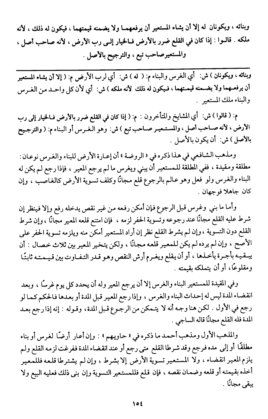 وفي المقيدة: للمستعير البناء والغرس إلا أن يرجع المعير وله أن يحدد كل يوم غرسا، وبعد انقضاء المدة ليس له إحداث البناء والغرس، وإذا رجع المعير قبل المدة أو بعدها فالحكم كما لو رجع في الأول، لكن هنا وجه أنه لا يتمكن من الرجوع قبل المدة، وقوله: إنه إذا رجع بعد المدة فله القلع مجانا قاله الساجي.