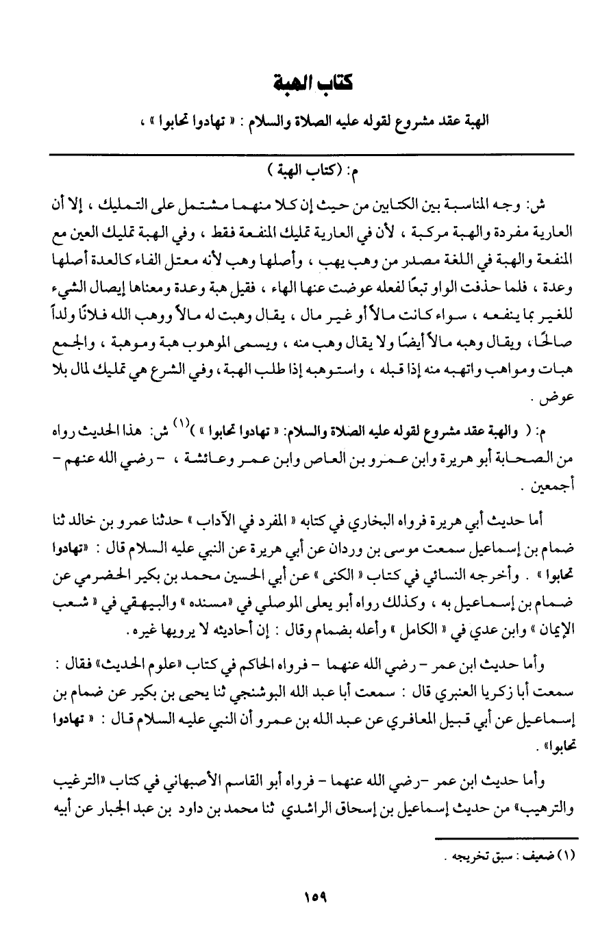 م: (والهبة عقد مشروع لقوله - عَلَيْهِ الصَّلَاةُ وَالسَّلَامُ -: «تهادوا تحابوا» ش: هذا الحديث رواه من الصحابة أبو هريرة وابن عمرو بن العاص وابن عمر وعائشة، - رَضِيَ اللَّهُ عَنْهُمْ - أجمعين.