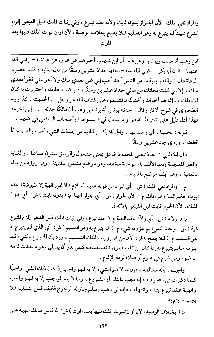 ـــــــــــــــــــــــــــــQابن وهب أنا مالك ويونس وغيرهما أن ابن شهاب أخبرهم عن عروة عن عائشة - رَضِيَ اللَّهُ عَنْهُمَا - " أن أبا بكر - رَضِيَ اللَّهُ عَنْهُ - نحلها جذاذ عشرين وسقا من مال الغابة، فلما حضرته الوفاة قال: والله يا بنية ما من الناس أحد أحب إلي غنى بعدي منك ولا أعز علي فقرا بعدي منك، إلا أني كنت نحلتك من مالي جذاذ عشرين وسقا، فلو كنت جذذته واحترزت به كان لك ذلك، وإنما هم أخواك وأختاك فاقتسموه على كتاب الله عز وجل.. الحديث، كذا رواه الطحاوي في شرح الآثار وقال: حدثنا يونس أخبرنا ابن وهب أن مالكا حدثه ... إلى آخره، فهذا أدل دليل على اشتراك القبض وبه استدل في " المبسوط " وأصحاب الشافعي في كتبهم.