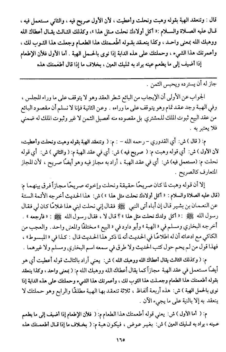 قال: وتنعقد الهبة بقوله وهبت ونحلت وأعطيت؛ لأن الأول صريح فيه، والثاني مستعمل فيه، قال - عَلَيْهِ الصَّلَاةُ وَالسَّلَامُ -: «أكل أولادك نحلت مثل هذا» ، وكذلك الثالث يقال: أعطاك الله ووهبك الله بمعنى واحد، وكذا ينعقد بقوله أطعمتك هذا الطعام وجعلت هذا الثوب لك، وأعمرتك هذا الشيء، وحملتك على هذه الدابة إذا نوى بالحمل الهبة. أما الأول فلأن الإطعام إذا أضيف إلى ما يطعم عينه يراد به تمليك العين، بخلاف ما إذا قال أطعمتك هذه.