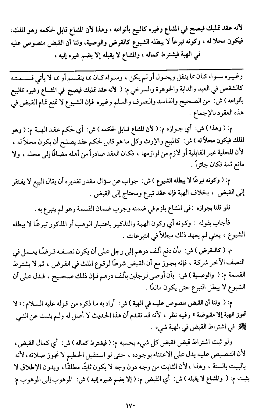 ـــــــــــــــــــــــــــــQوغيره سواء كان مما ينقل ويحول أو لم يكن، سواء كان مما ينقسم أو مما لا يأتي قسمته كالشقص في العبد والدابة والجوهرة والسرخي م: (لأنه عقد تمليك فيصح في المشاع وغيره كالبيع بأنواعه) ش: من الصحيح والفاسد والصرف والسلم وغيره فإن الشيوع لا تمنع تمام القبض في هذه العقود بالإجماع.