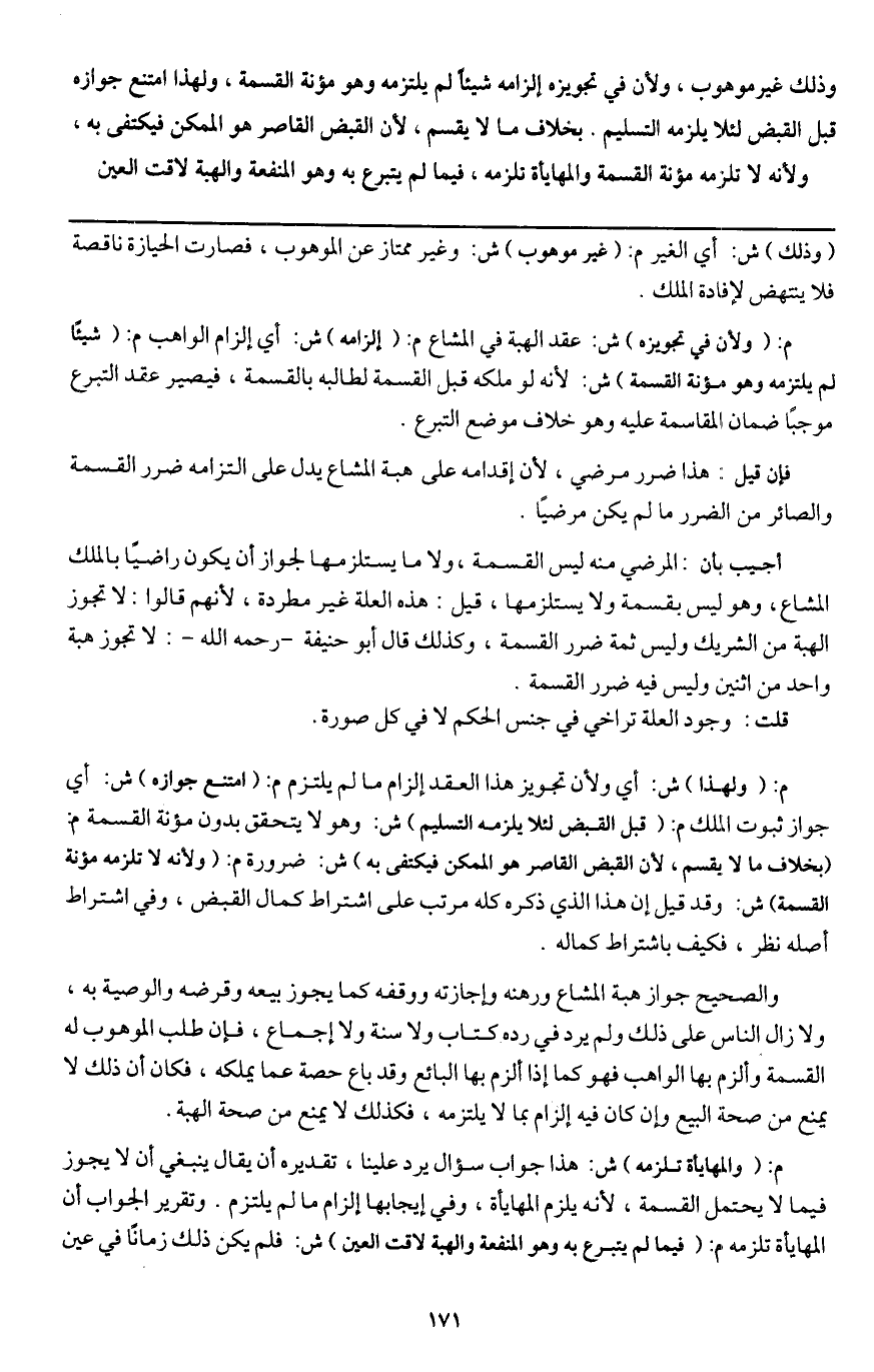والصحيح جواز هبة المشاع ورهنه وإجازته ووقفه كما يجوز بيعه وقرضه والوصية به، ولا زال الناس على ذلك ولم يرد في رده كتاب ولا سنة ولا إجماع، فإن طلب الموهوب له القسمة وألزم بها الواهب فهو كما إذا ألزم بها البائع وقد باع حصة عما يملكه، فكان أن ذلك لا يمنع من صحة البيع وإن كان فيه إلزام بما لا يلتزمه، فكذلك لا يمنع من صحة الهبة.