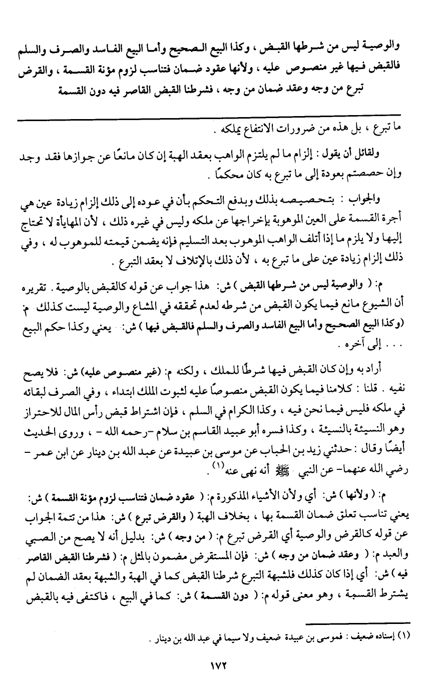 والوصية ليس من شرطها القبض، وكذا البيع الصحيح وأما البيع الفاسد والصرف والسلم فالقبض فيها غير منصوص عليه، ولأنها عقود ضمان فتناسب لزوم مؤنة القسمة، والقرض تبرع من وجه وعقد ضمان من وجه، فشرطنا القبض القاصر فيه دون القسمة.