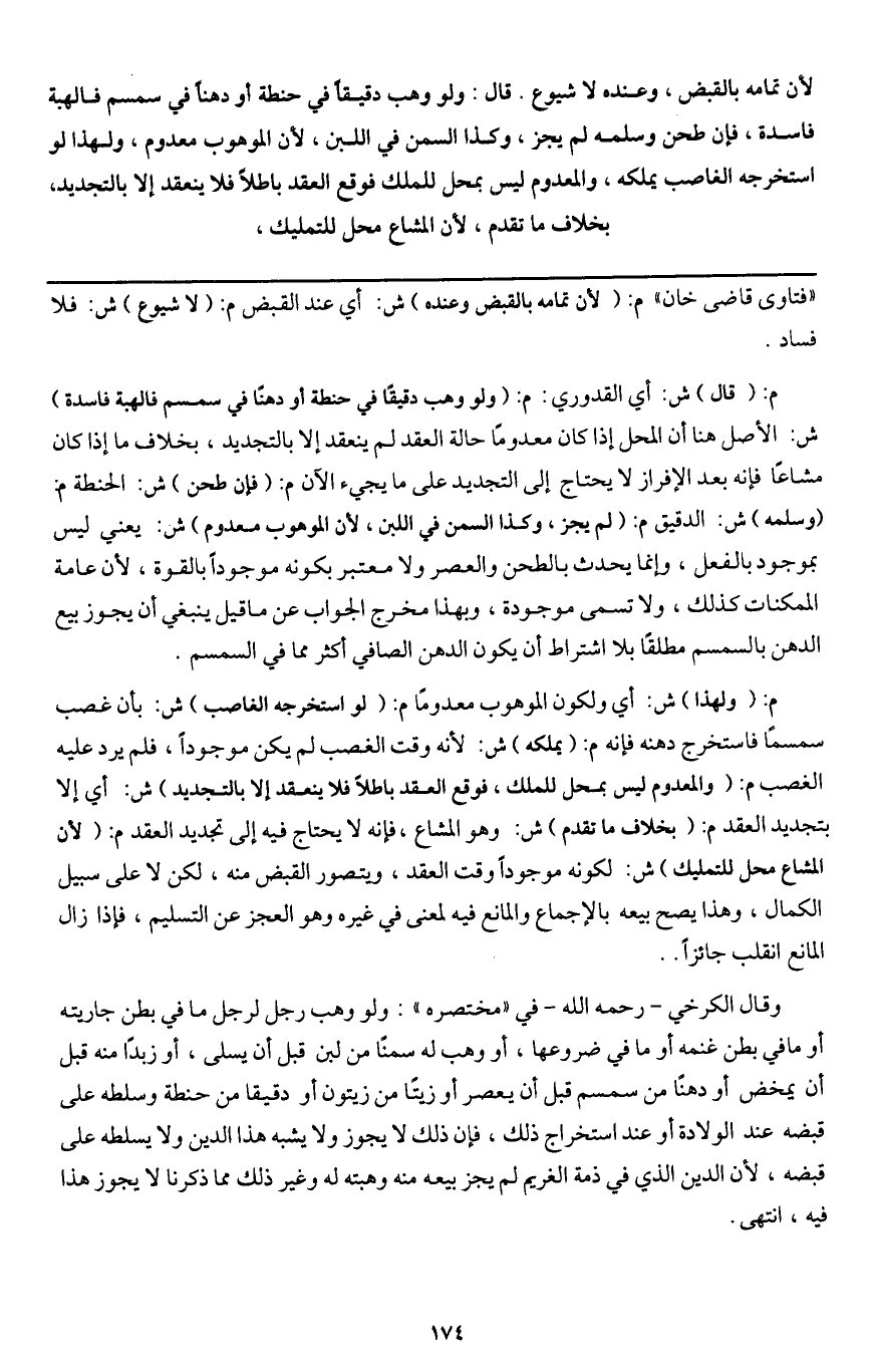 وقال الكرخي - رَحِمَهُ اللَّهُ - في " مختصره ": ولو وهب رجل لرجل ما في بطن جاريته أو ما في بطن غنمه أو ما في ضروعها، أو وهب له سمنًا من لبن قبل أن يسلى، أو زبدًا منه قبل أن يمخض أو دهنًا من سمسم قبل أن يعصر أو زيتا من زيتون أو دقيقا من حنطة وسلطه على قبضه عند الولادة أو عند استخراج ذلك، فإن ذلك لا يجوز ولا يشبه هذا الدين ولا يسلطه على قبضه؛ لأن الدين الذي في ذمة الغريم لم يجز بيعه منه وهبته له، وغير ذلك مما ذكرنا لا يجوز هذا فيه، انتهى.