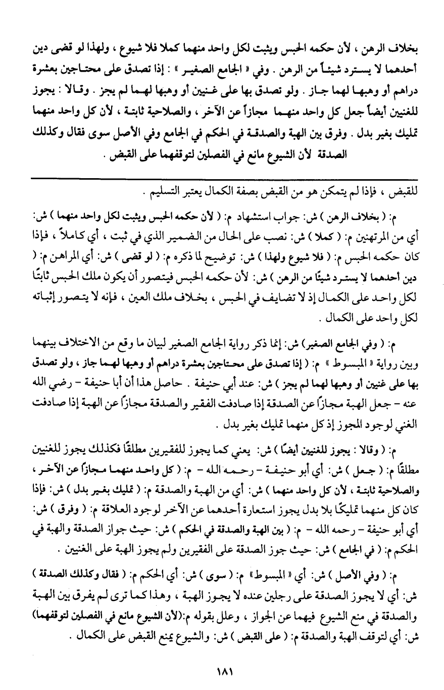 بخلاف الرهن؛ لأن حكمه الحبس ويثبت لكل واحد منهما كملا فلا شيوع، ولهذا لو قضى دين أحدهما لا يسترد شيئا من الرهن. وفي " الجامع الصغير ": إذا تصدق على محتاجين بعشرة دراهم أو وهبها لهما جاز. ولو تصدق بها على غنيين أو وهبها لهما لم يجز. وقالا: يجوز للغنيين أيضا جعل كل واحد منهما مجازا عن الآخر، والصلاحية ثابتة؛ لأن لكل واحد منهما تمليك بغير بدل. وفرق بين الهبة والصدقة في الحكم في الجامع وفي الأصل سوى، فقال وكذلك الصدقة؛ لأن الشيوع مانع في الفصلين لتوقفهما على القبض.