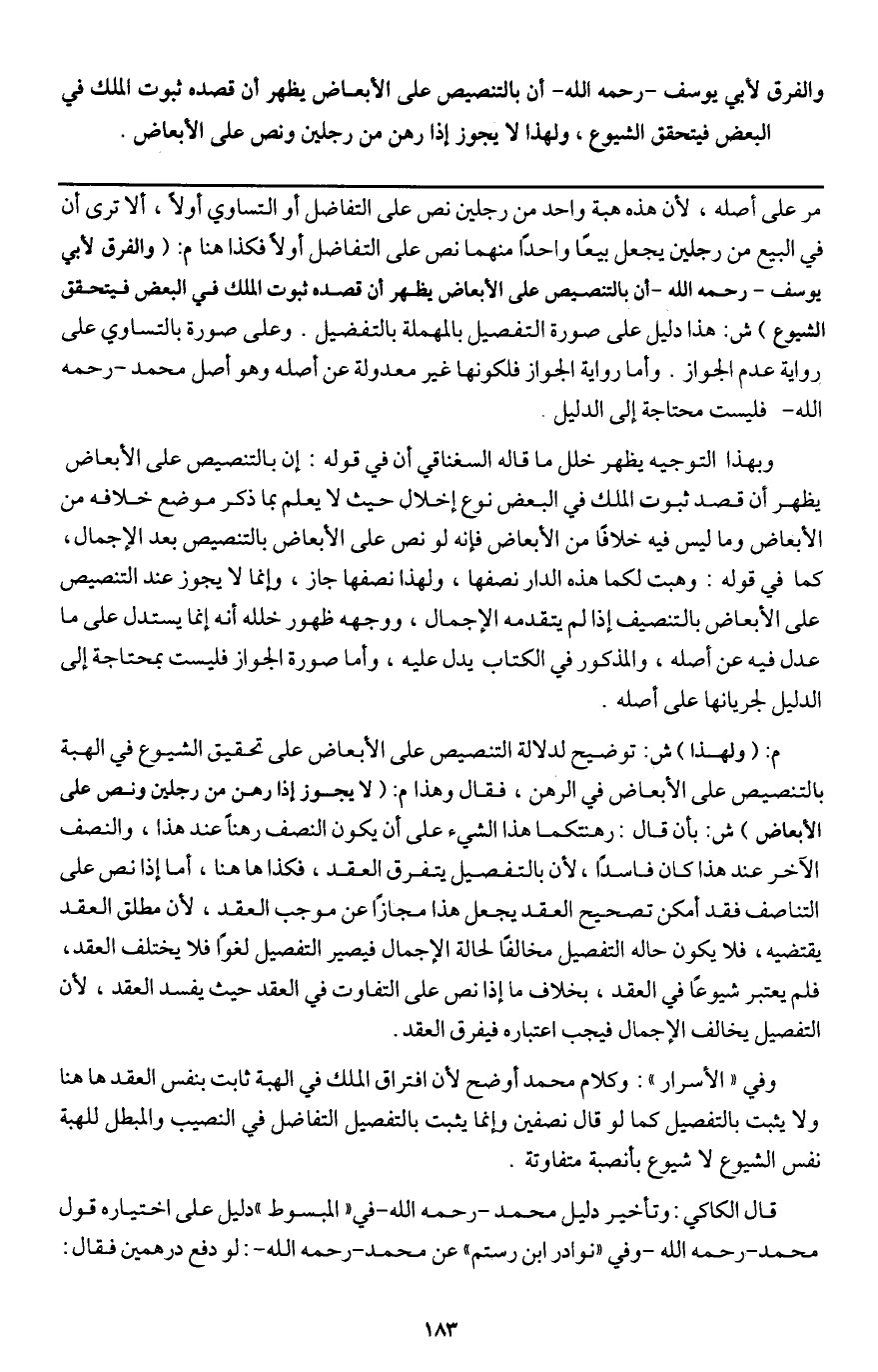 وبهذا التوجيه يظهر خلل ما قاله السغناقي أن في قوله: إن بالتنصيص على الأبعاض يظهر أن قصد ثبوت الملك في البعض نوع إخلال حيث لا يعلم بما ذكر موضع خلافه من الأبعاض وما ليس فيه خلافا من الأبعاض فإنه لو نص على الأبعاض بالتنصيص بعد الإجمال، كما في قوله: وهبت لكما هذه الدار نصفها، ولهذا نصفها جاز، وإنما لا يجوز عند التنصيص على الأبعاض بالتنصيف إذا لم يتقدمه الإجمال، ووجهه ظهور خلله أنه إنما يستدل على ما عدل فيه عن أصله، والمذكور في الكتاب يدل عليه، وأما صورة الجواز فليست بمحتاجة إلى الدليل لجريانها على أصله.