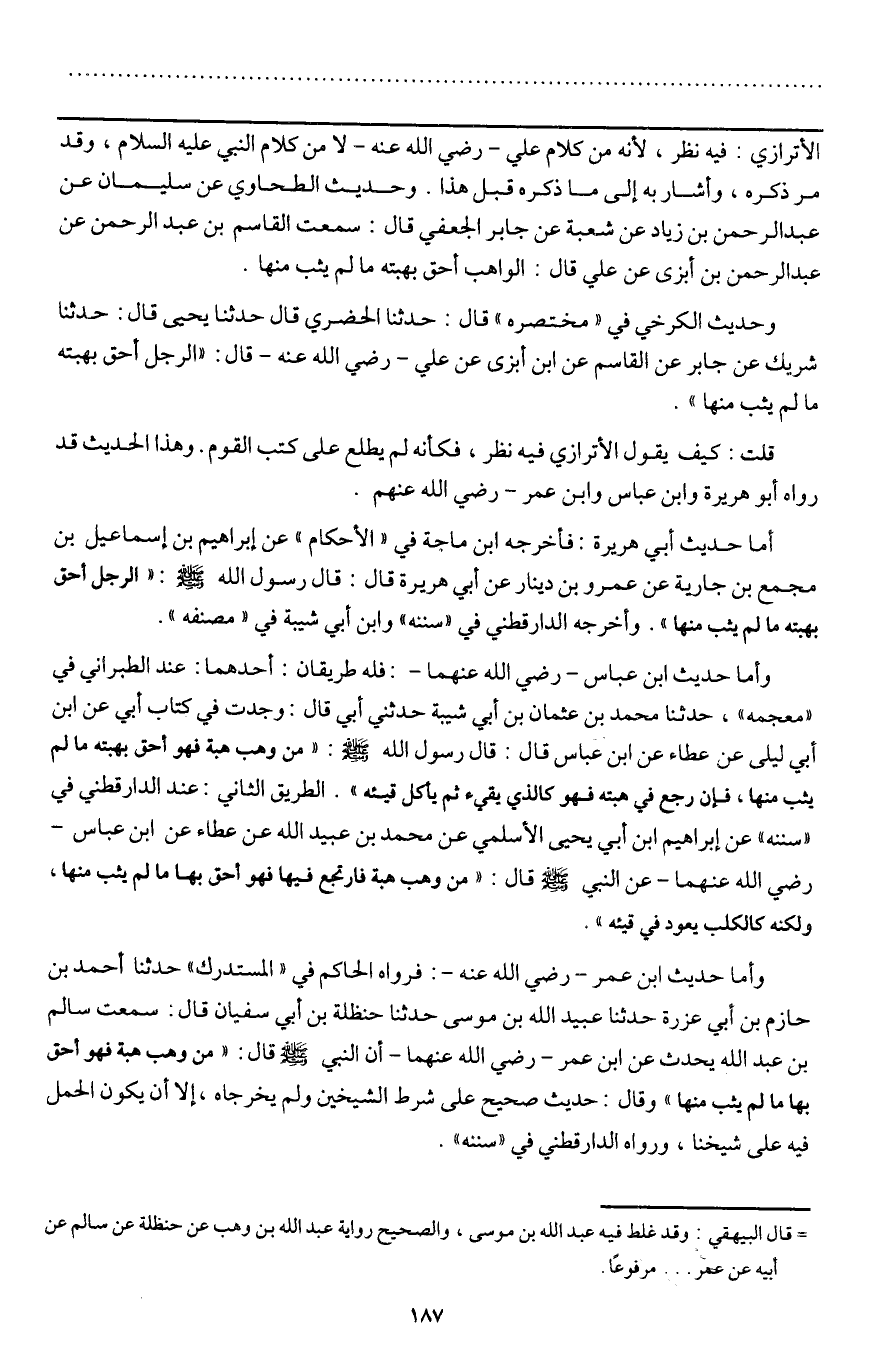 ـــــــــــــــــــــــــــــQالأترازي: فيه نظر؛ لأنه من كلام علي - رَضِيَ اللَّهُ عَنْهُ - لا من كلام النبي - عَلَيْهِ السَّلَامُ -، وقد مر ذكره، وأشار به إلى ما ذكره قبل هذا. وحديث الطحاوي عن سليمان عن عبد الرحمن بن زياد عن شعبة عن جابر الجعفي قال: سمعت القاسم بن عبد الرحمن عن عبد الرحمن بن أبزى عن علي قال: الواهب أحق بهبته ما لم يثب منها.