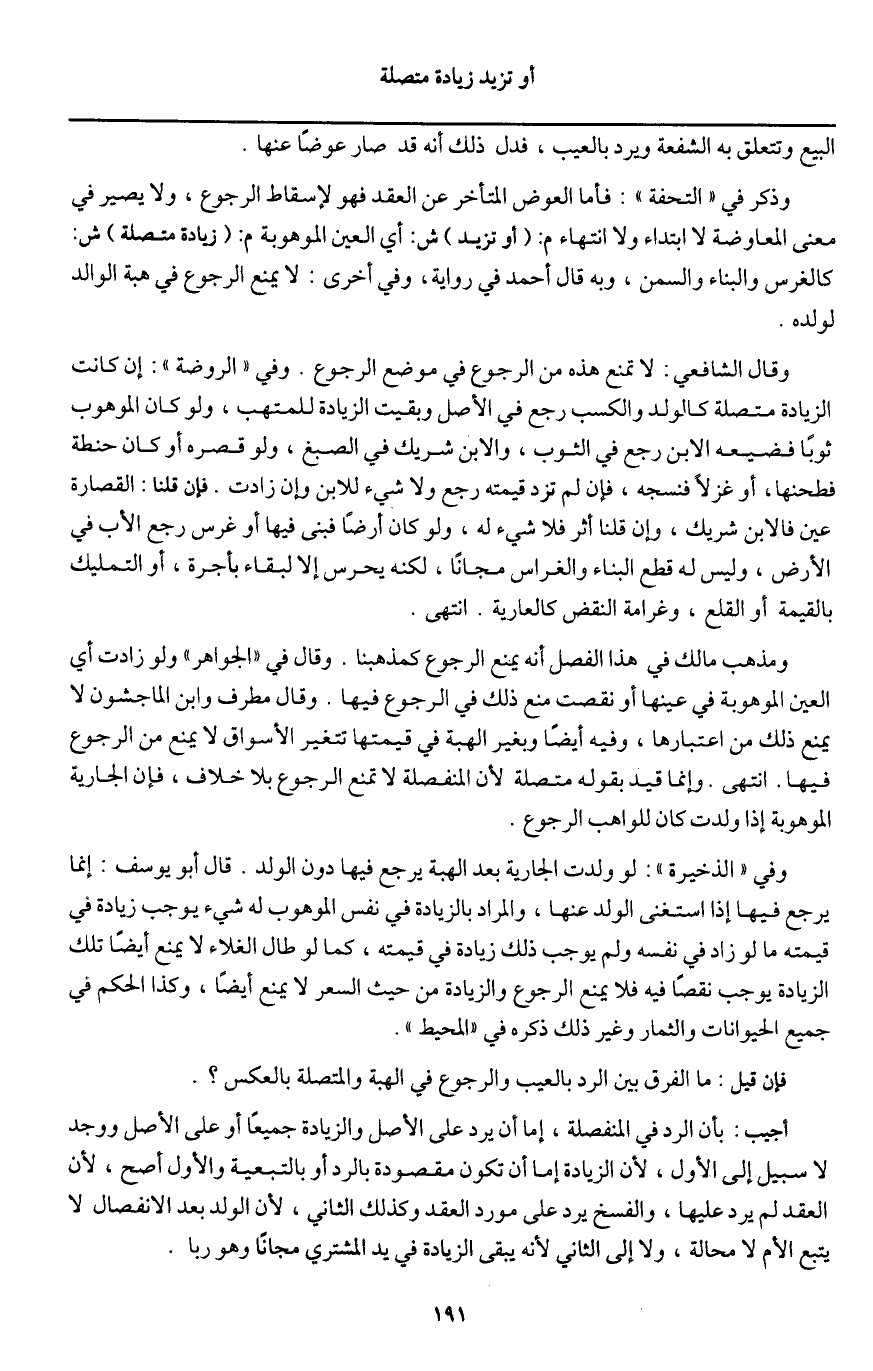 أجيب: بأن الرد في المنفصلة، إما أن يرد على الأصل والزيادة جميعا أو على الأصل ووجد لا سبيل إلى الأول؛ لأن الزيادة أما أن تكون مقصودة بالرد أو بالتبعية والأول أصح؛ لأن العقد لم يرد عليها، والفسخ يرد على مورد العقد وكذلك الثاني؛ لأن الولد بعد الانفصال لا يتبع الأم لا محالة، ولا إلى الثاني لأنه يبقى الزيادة في يد المشتري مجانًا وهو ربا.