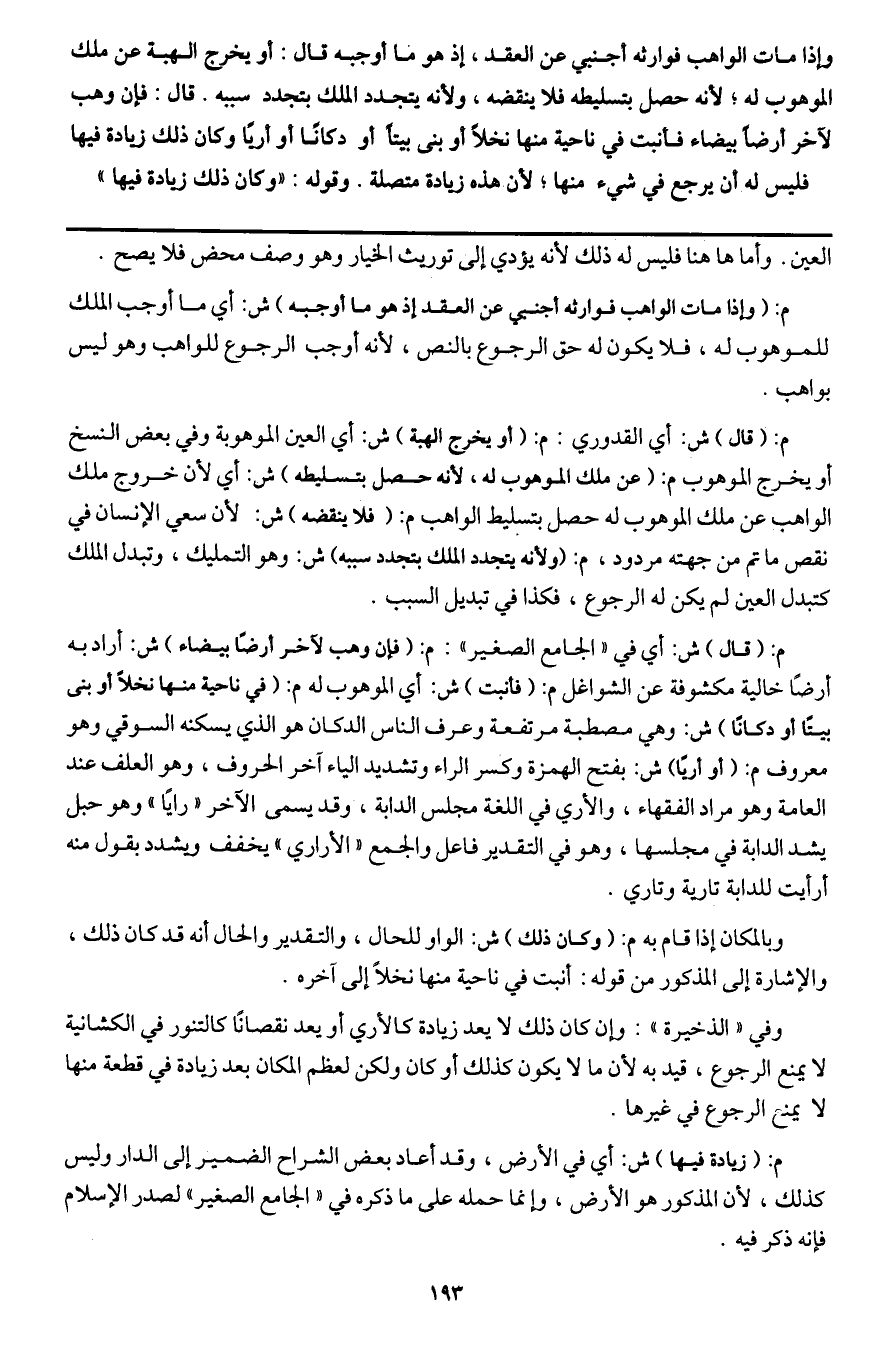 م: (قال) ش: أي في " الجامع الصغير ": م: (فإن وهب لآخر أرضًا بيضاء) ش: أراد به أرضًا خالية مكشوفة عن الشواغل م: (فأنبت) ش: أي الموهوب له م: (في ناحية منها نخلًا أو بنى بيتًا أو دكانًا) ش: وهي مصطبة مرتفعة وعرف الناس الدكان هو الذي يسكنه السوقي وهو معروف م: (أو أريًا) ش: بفتح الهمزة وكسر الراء وتشديد الياء آخر الحروف، وهو العلف عند العامة وهو مراد الفقهاء، والأري في اللغة مجلس الدابة، وقد يسمى الآخر " رايًا " وهو حبل يشد الدابة في مجلسها، وهو في التقدير فاعل والجمع " الأراري " يخفف ويشدد بقول منه أرأيت للدابة تارية وتاري.