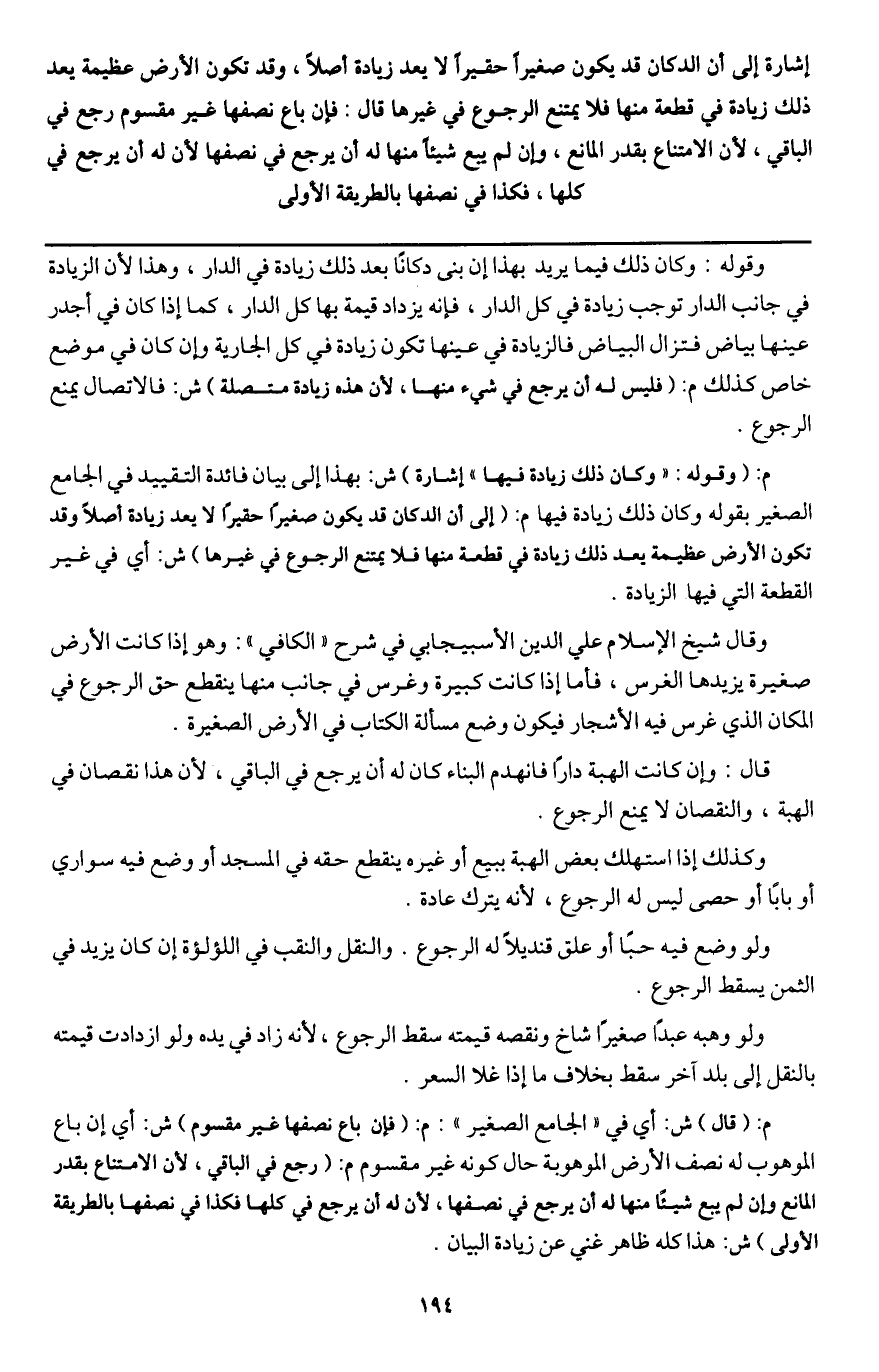 م: (وقوله: " وكان ذلك زيادة فيها " إشارة) ش: بهذا إلى بيان فائدة التقييد في الجامع الصغير بقوله وكان ذلك زيادة فيها م: (إلى أن الدكان قد يكون صغيرا حقيرا لا يعد زيادة أصلًا، وقد تكون الأرض عظيمة بعد ذلك زيادة في قطعة منها فلا يمتنع الرجوع في غيرها) ش: أي في غير القطعة التي فيها الزيادة.