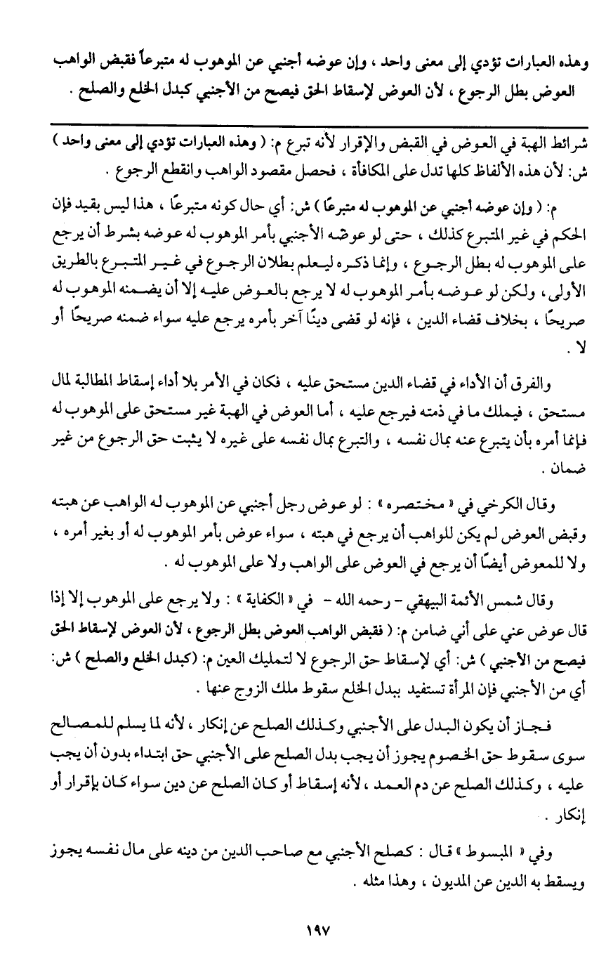 وقال شمس الأئمة البيهقي - رَحِمَهُ اللَّهُ - في " الكفاية ": ولا يرجع على الموهوب إلا إذا قال عوض عني على أني ضامن م: (فقبض الواهب العوض بطل الرجوع؛ لأن العوض لإسقاط الحق فيصح من الأجنبي) ش: أي لإسقاط حق الرجوع لا لتمليك العين م: (كبدل الخلع والصلح) ش: أي من الأجنبي فإن المرأة تستفيد ببدل الخلع سقوط ملك الزوج عنها.